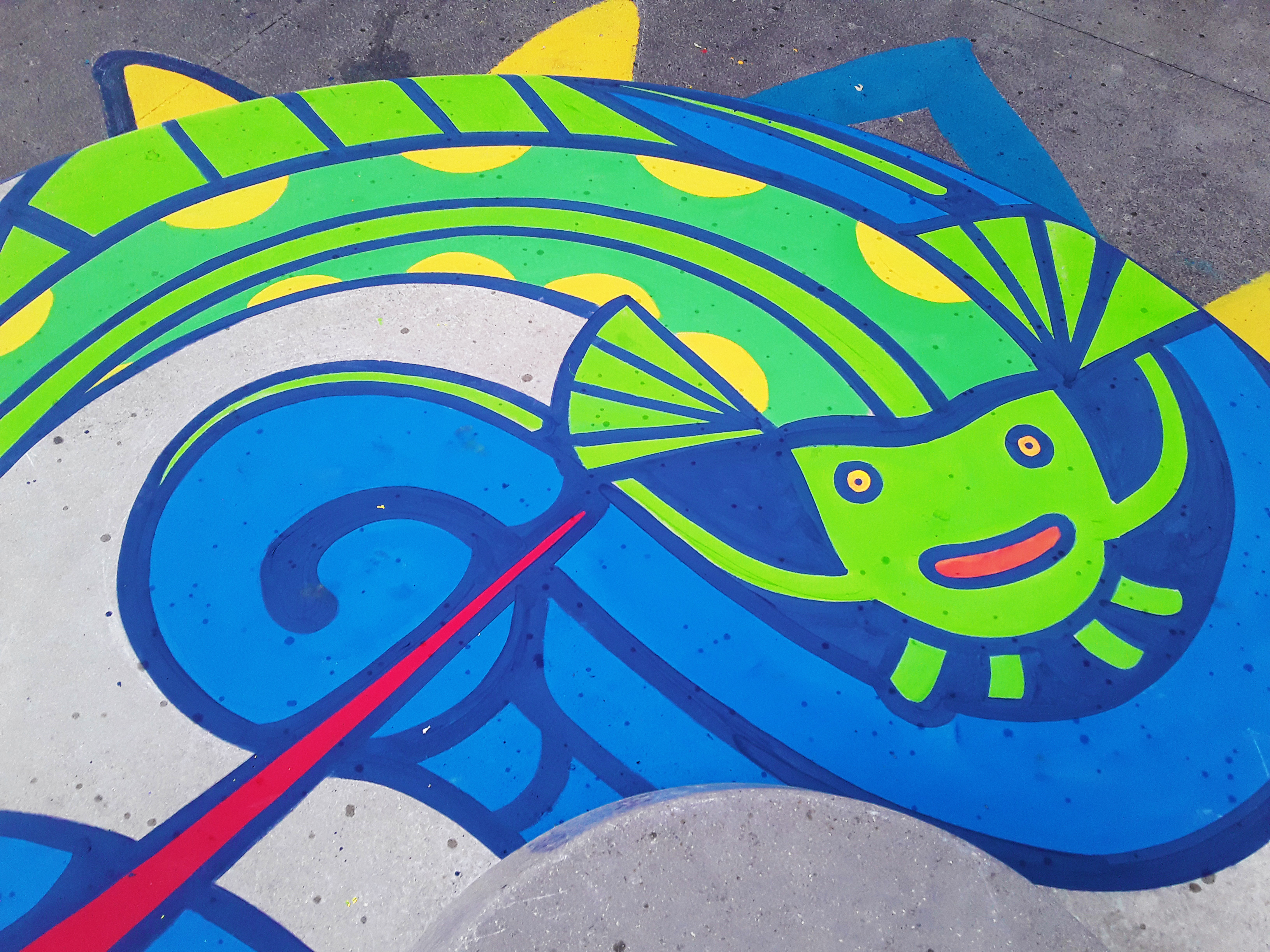 Motif éphémère réalisé sur un banc en béton dans le quartier de Confluence à Lyon.