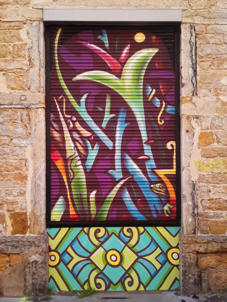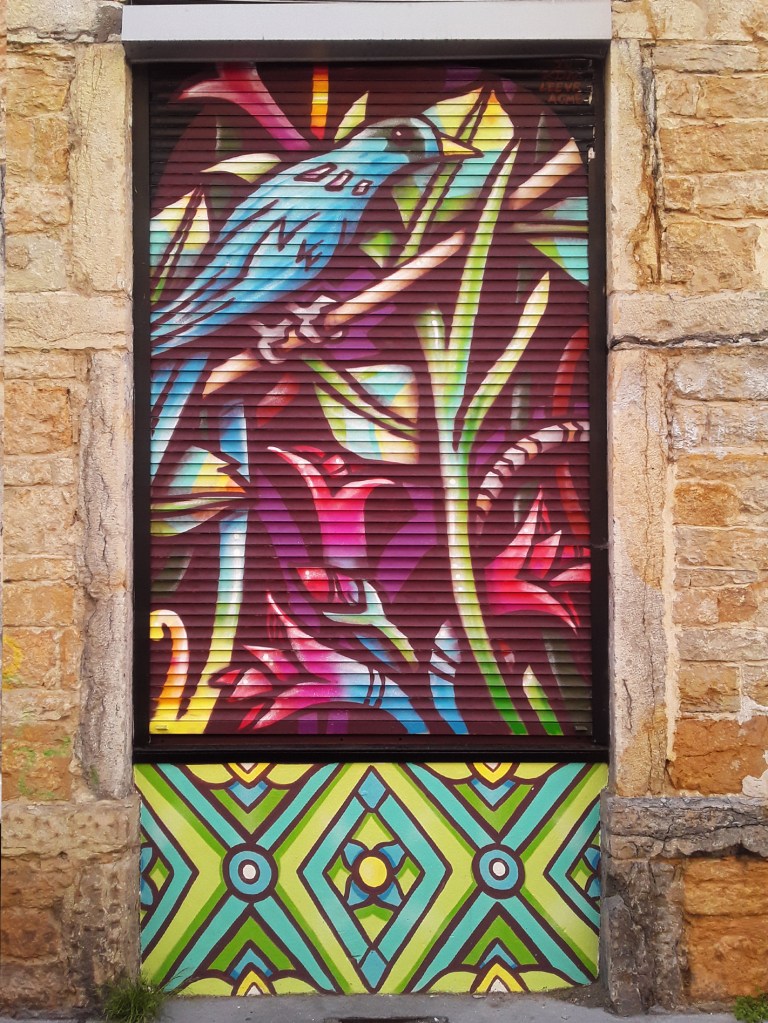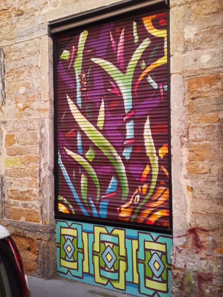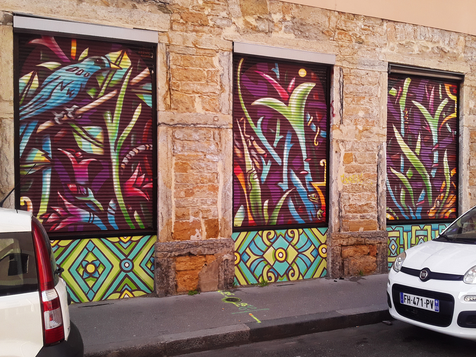 Flores de stores « Flores Storensis Diversificae » Peinture sur store de composition végétale et animale. Fonctionne de jour et de nuit. Peinture spray, Acrylique et brosses – 2023 Similaire