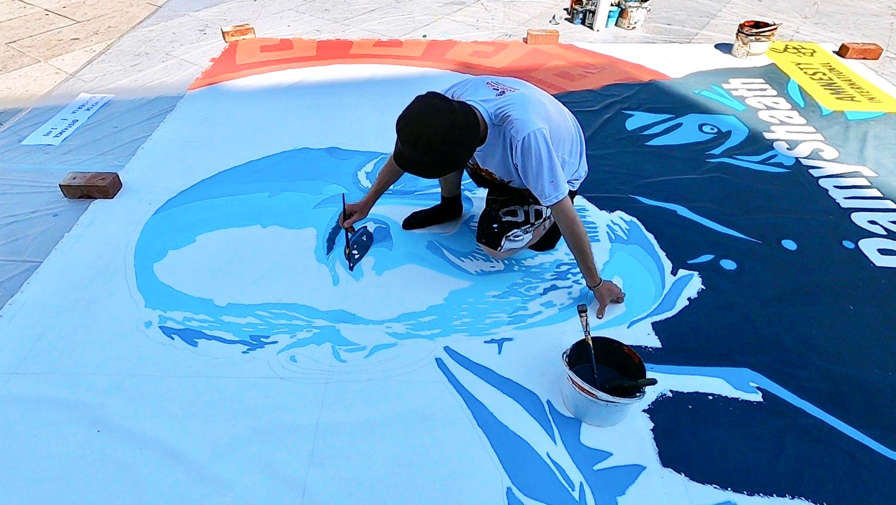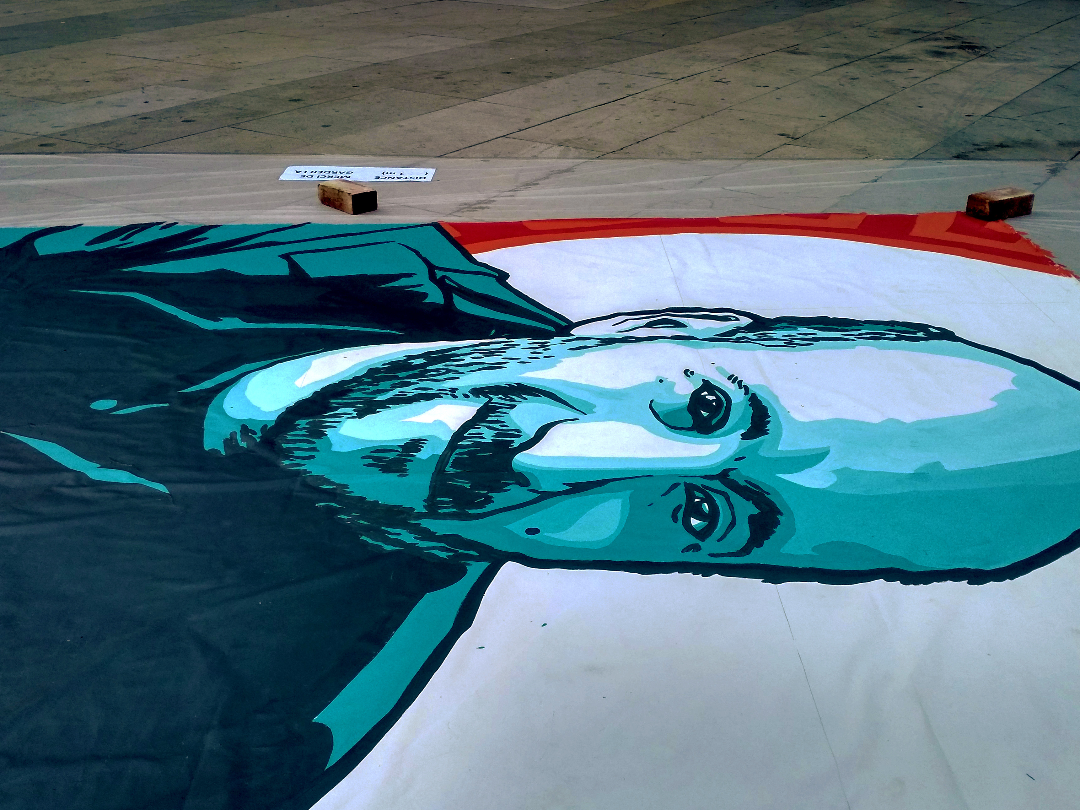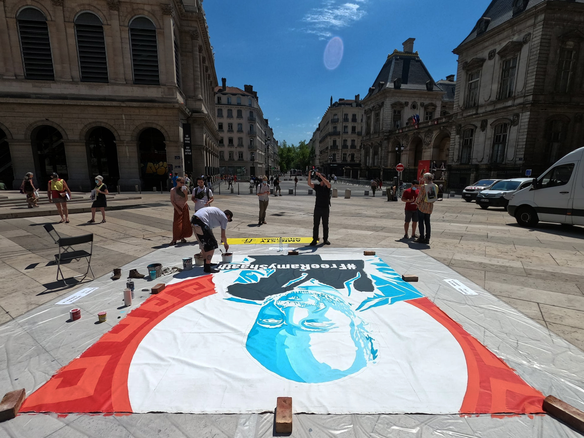 Peinture sur toile de 4m X 4m au sol sur la place de l’Hotel de ville de Lyon pour demander la libération du prisonnier d’opinion Ramy Shaath.