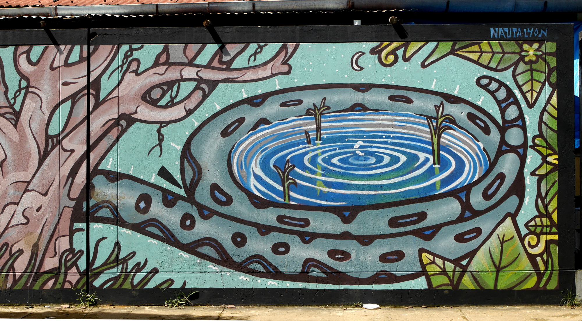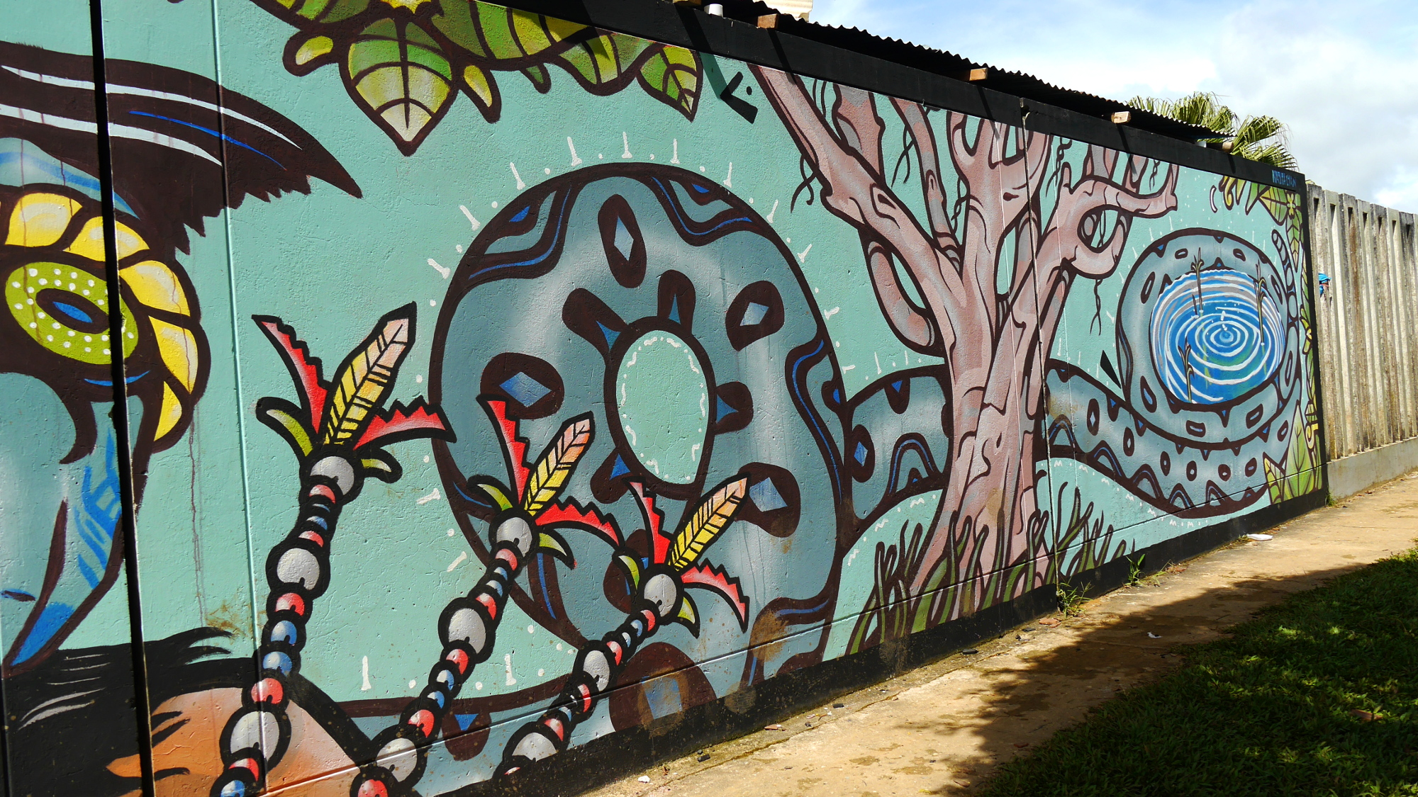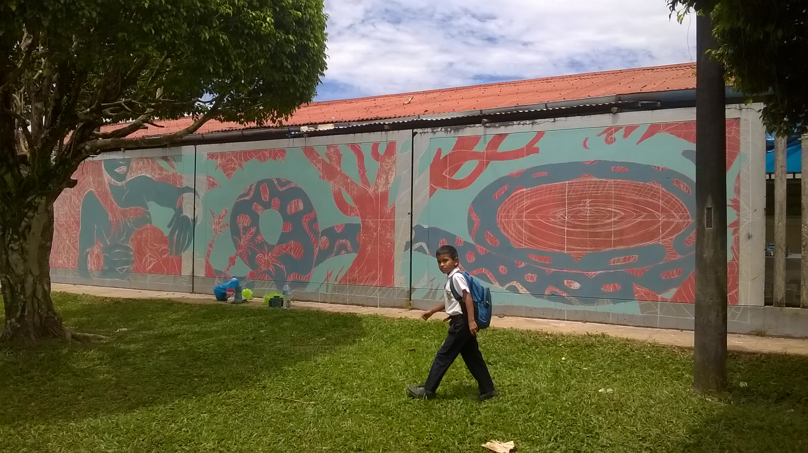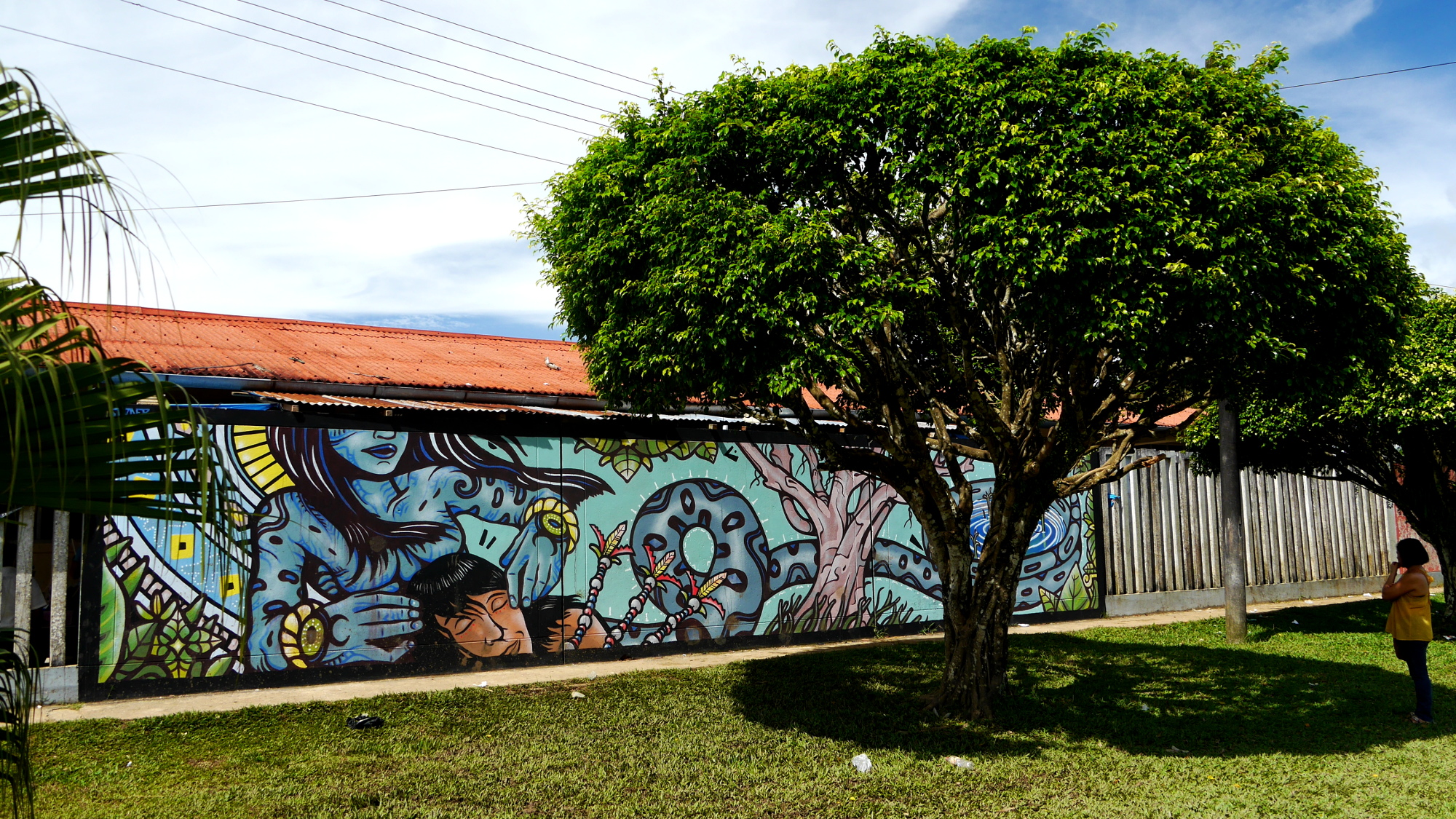 La femme-boa et le chasseur Mur peint inspiré du conte indigène « La mujer-boa » réalisé sur le mur d’un collège de Nauta, en Amazonie Péruvienne. Peinture acrylique et brosses – 2017 Similaire
