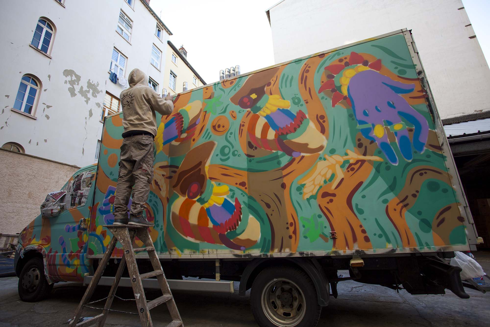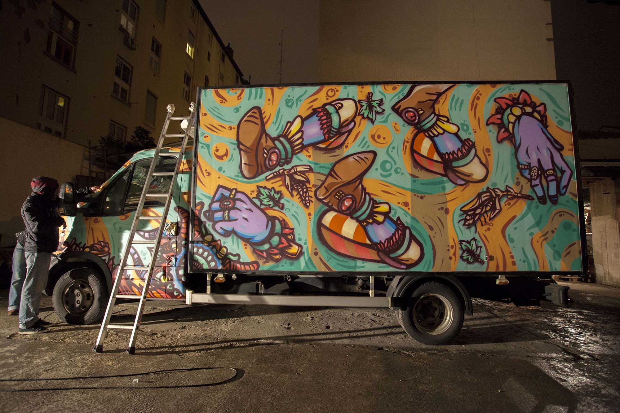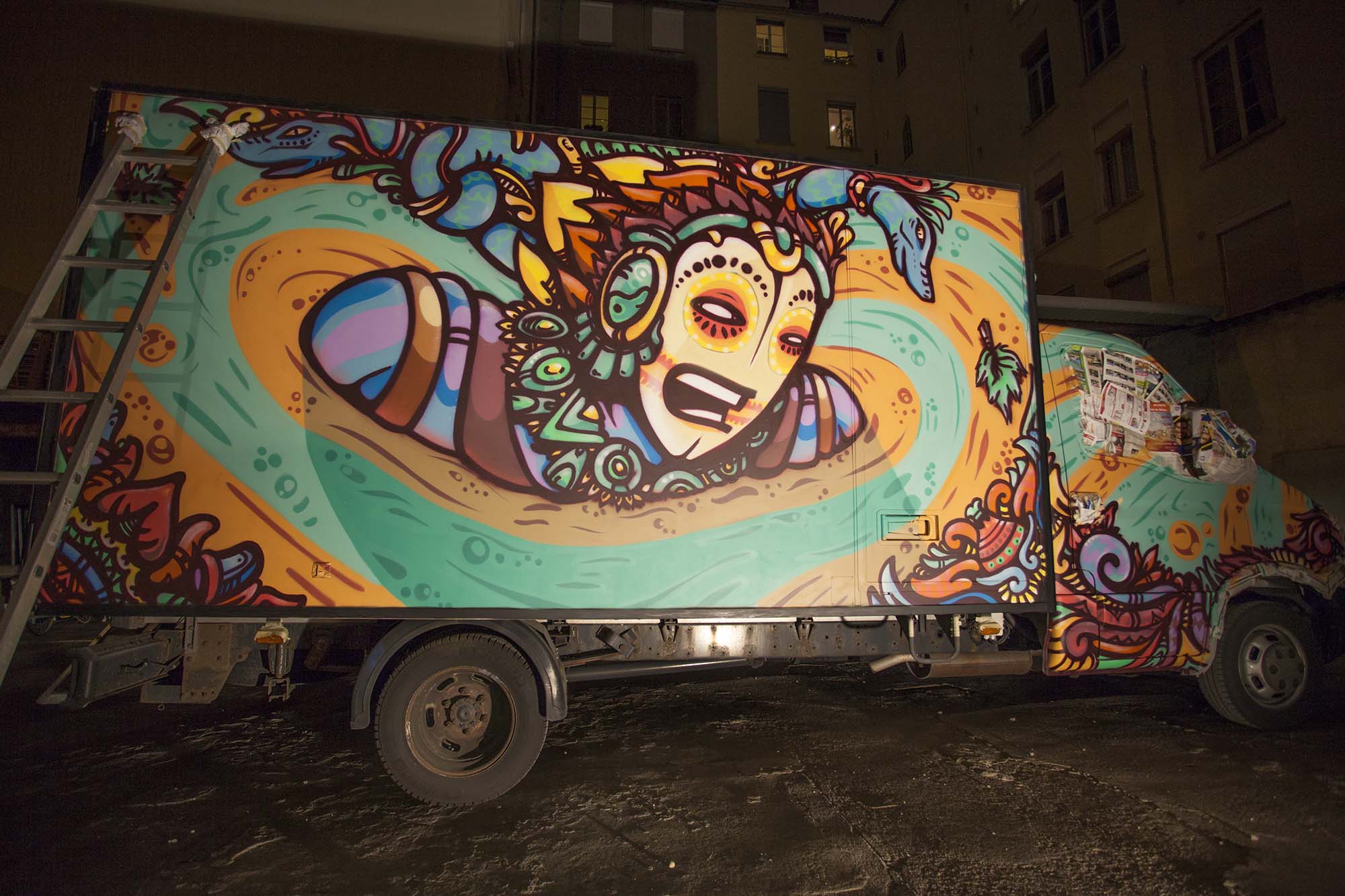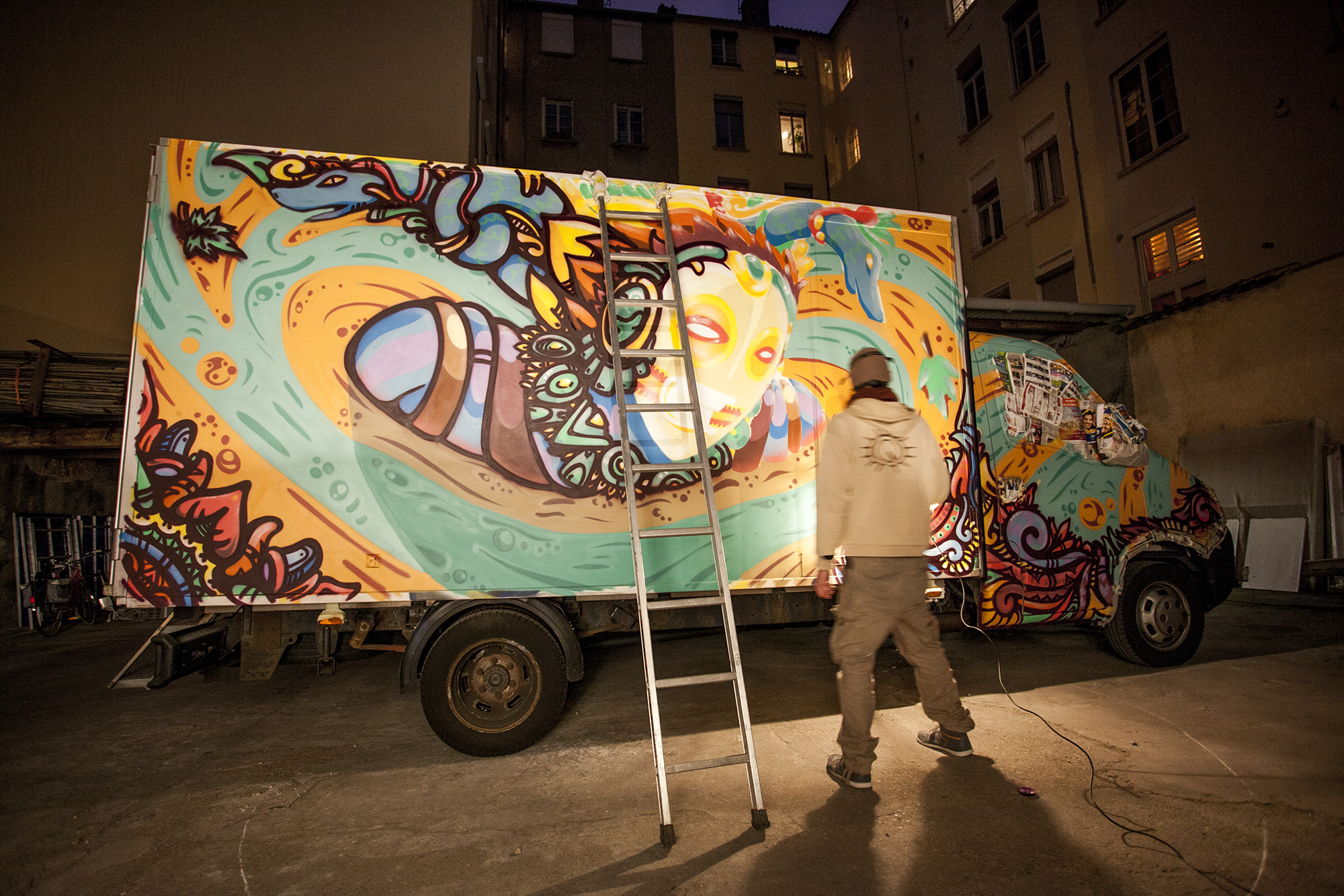 Le camion d’Osteria Valenti Peinture du camion frigorifié d’une épicerie / restaurant Sicilienne à Lyon. Peinture spray pour une meilleure tenue sur la carrosserie. 2014 Similaire