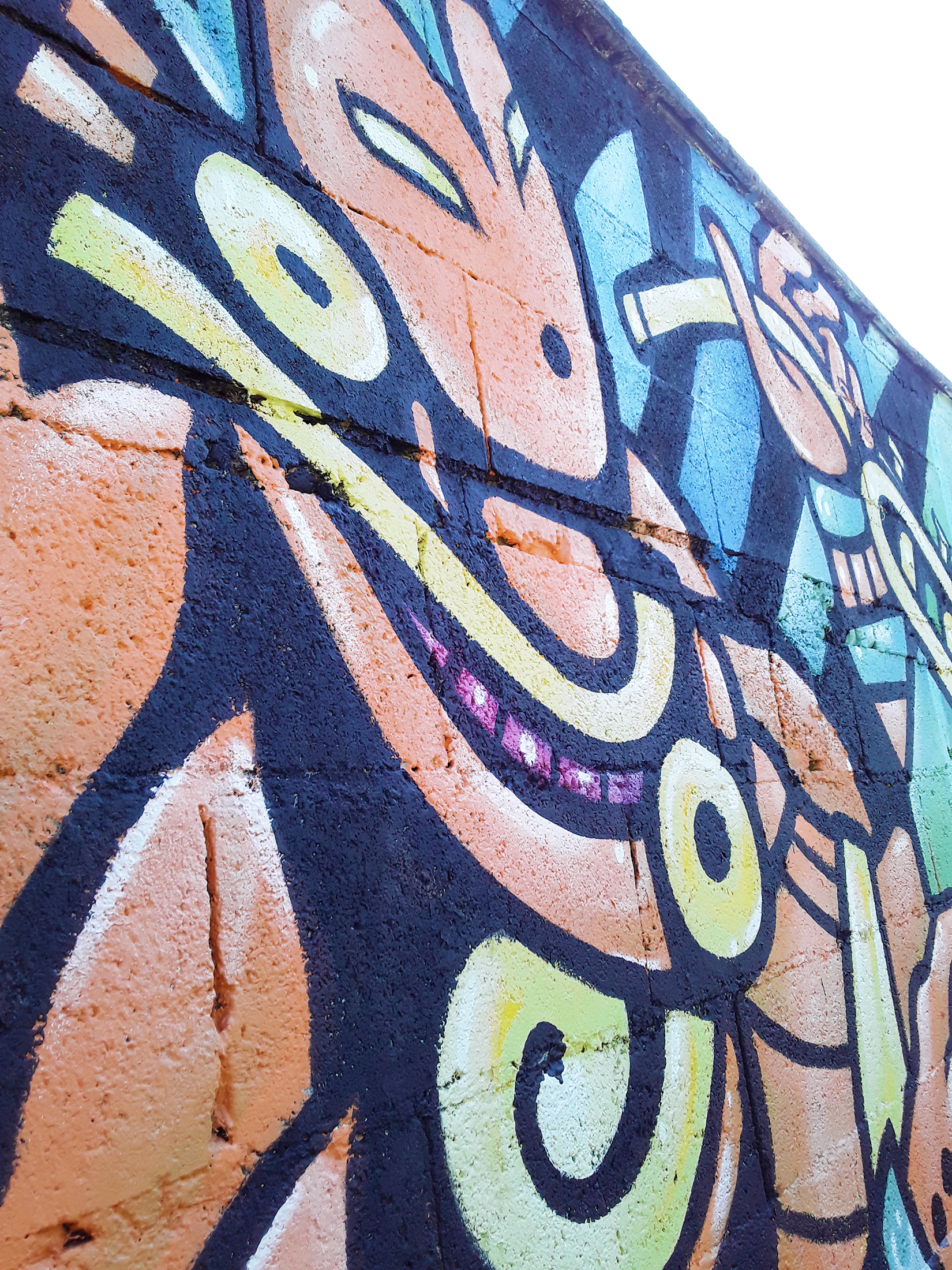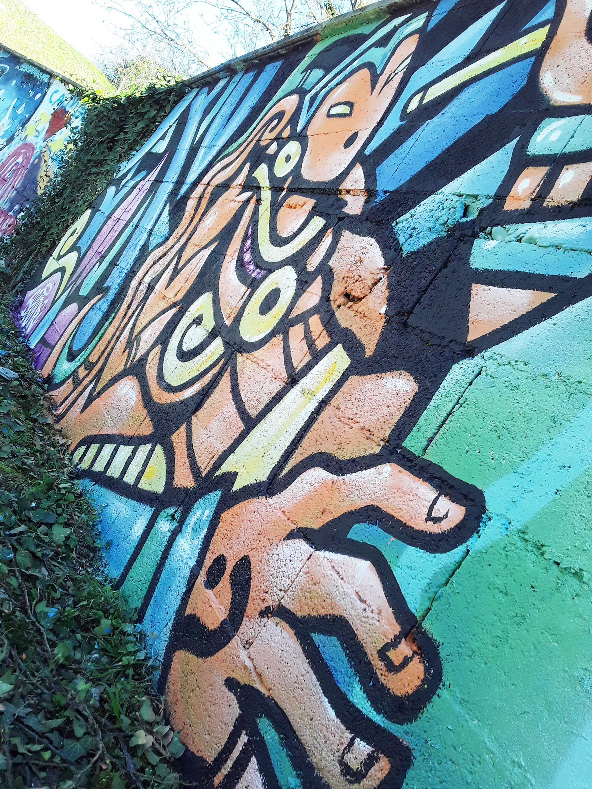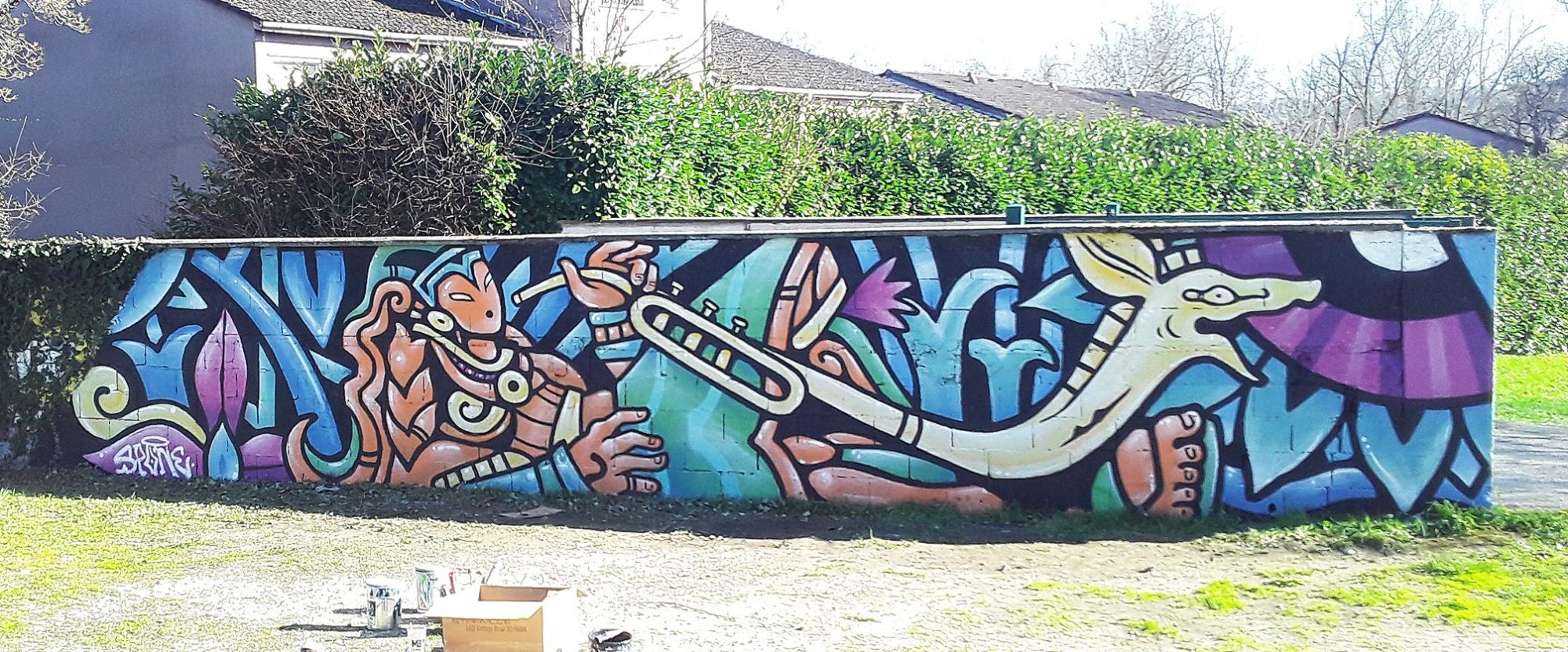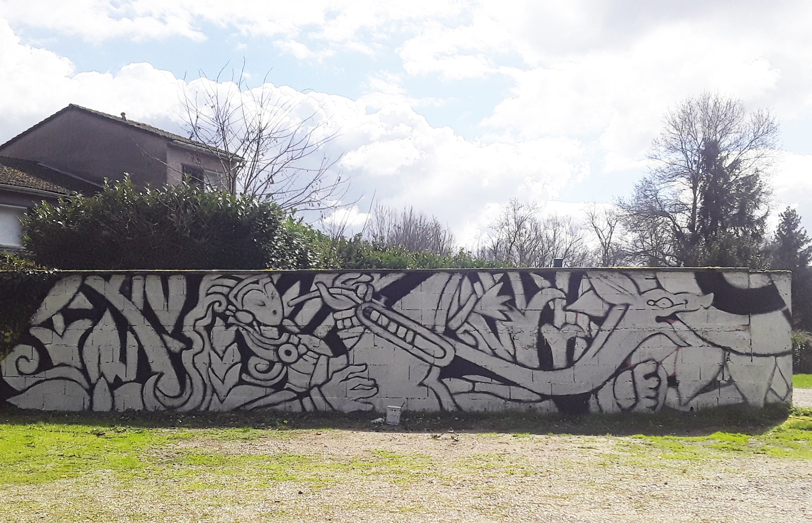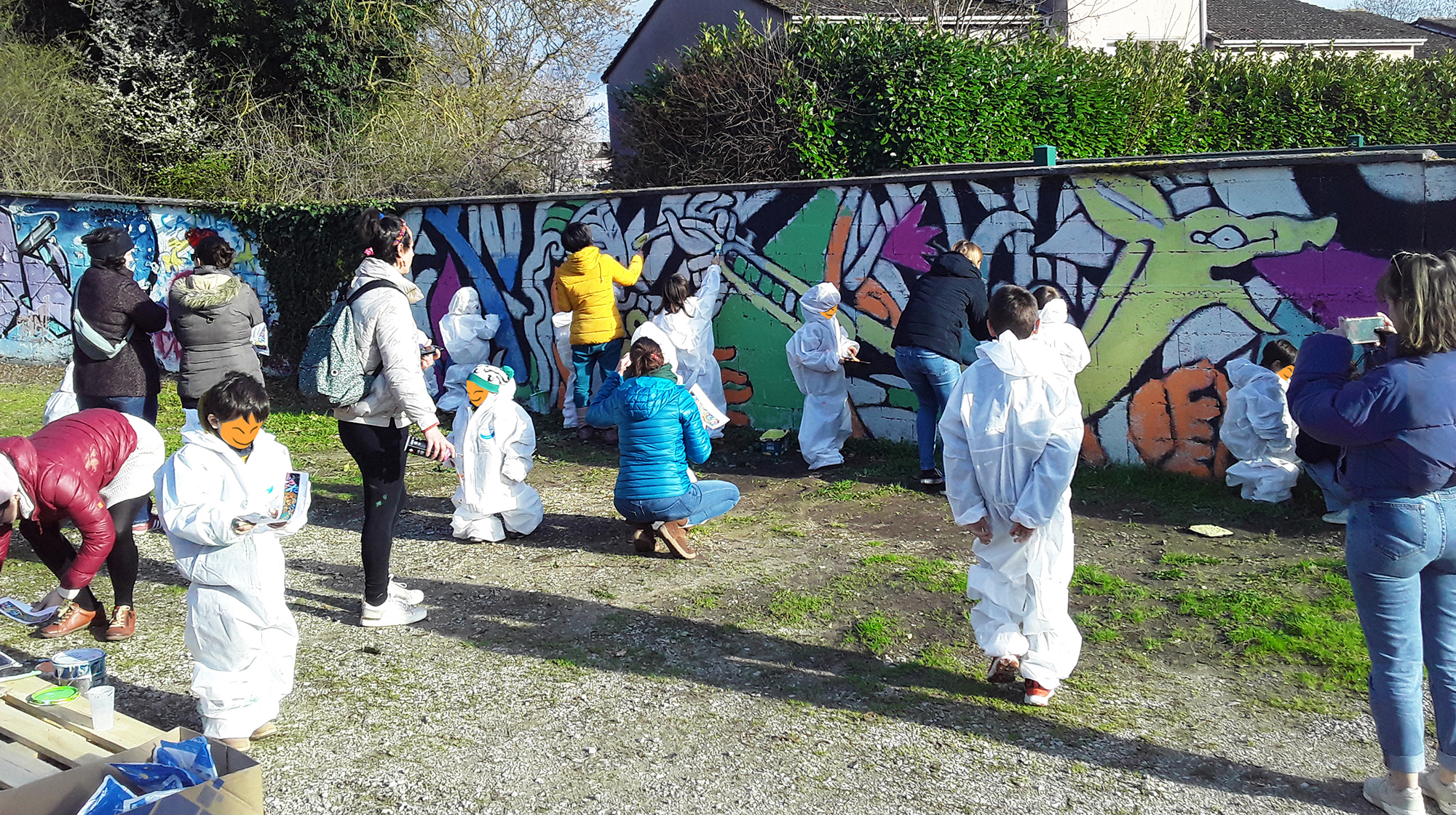 Petite réalisation participative sur un mur de la salle Le Millénium à l’Isle d’Abeau, avec des enfants de 4 à 7 ans.