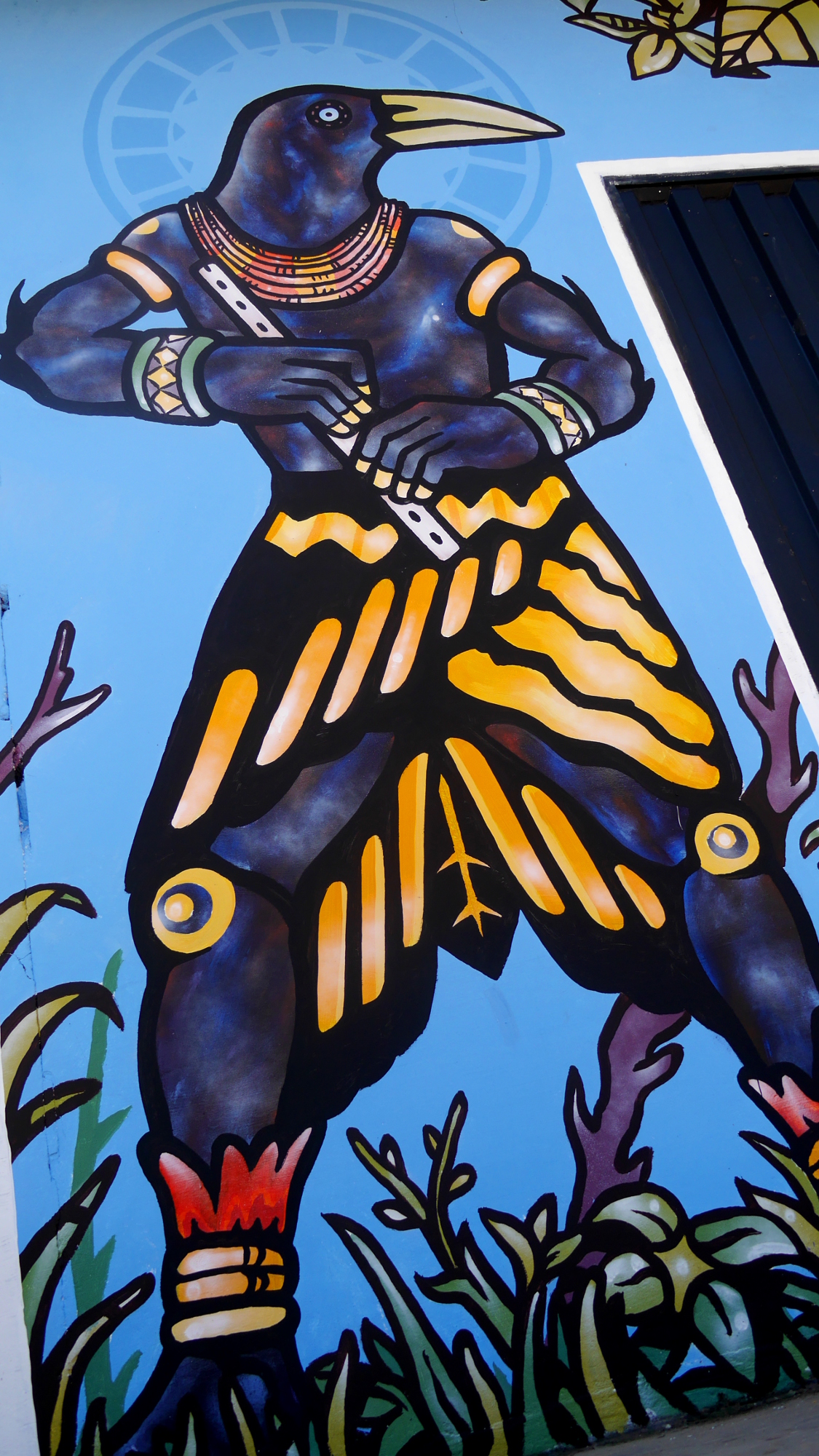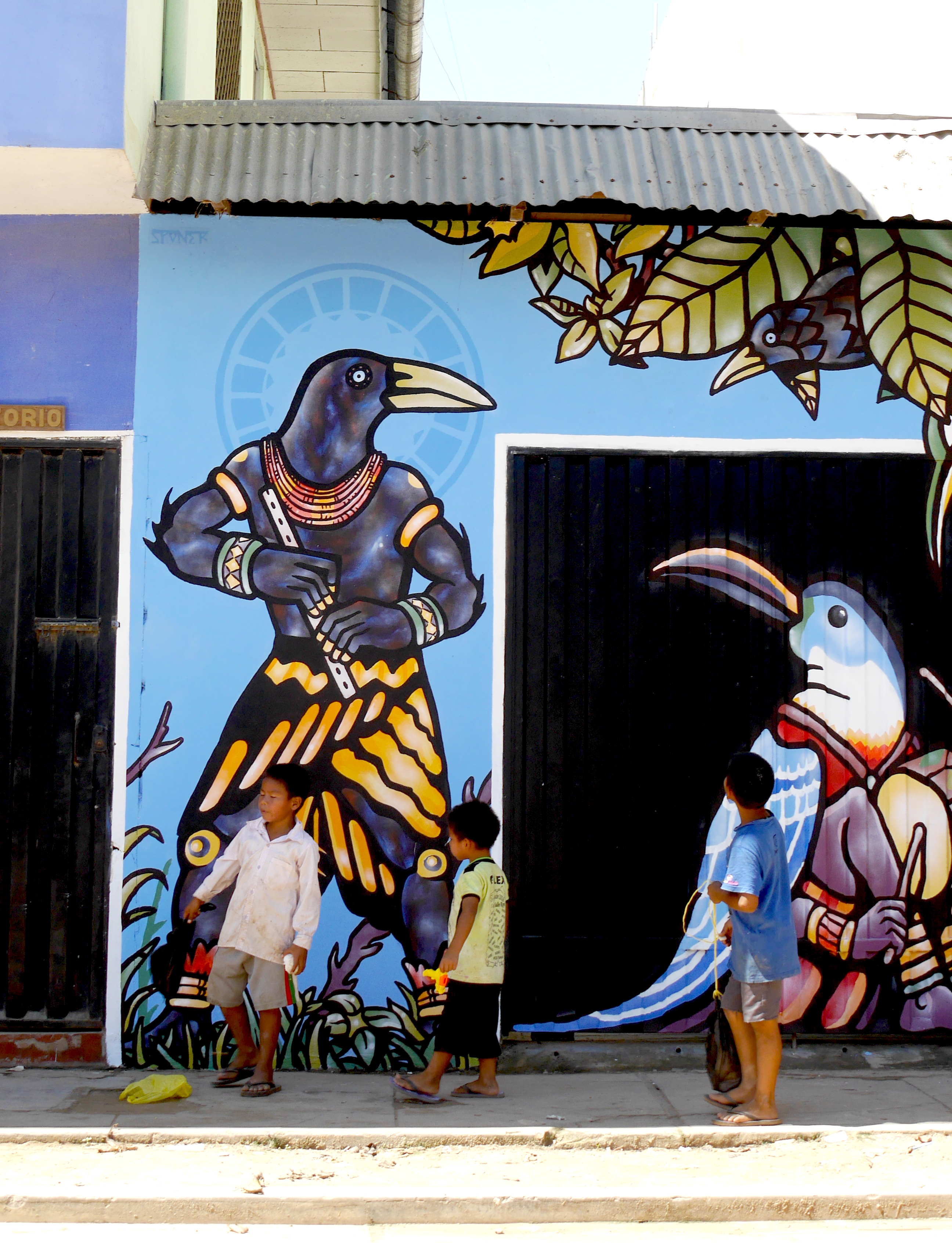Le paucar et le toucan Mur peint sur l’entrée de la Radio Ucamara, espace social et culturel indépendant à Nauta, Amazonie Péruvienne. Peinture acrylique, brosses et spray blanche – 2017 Similaire