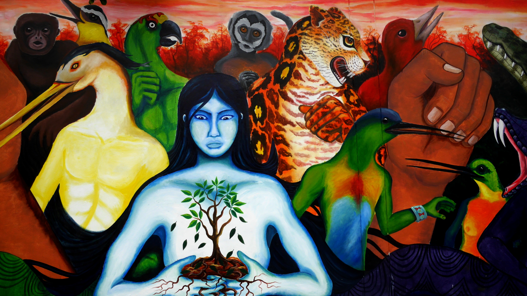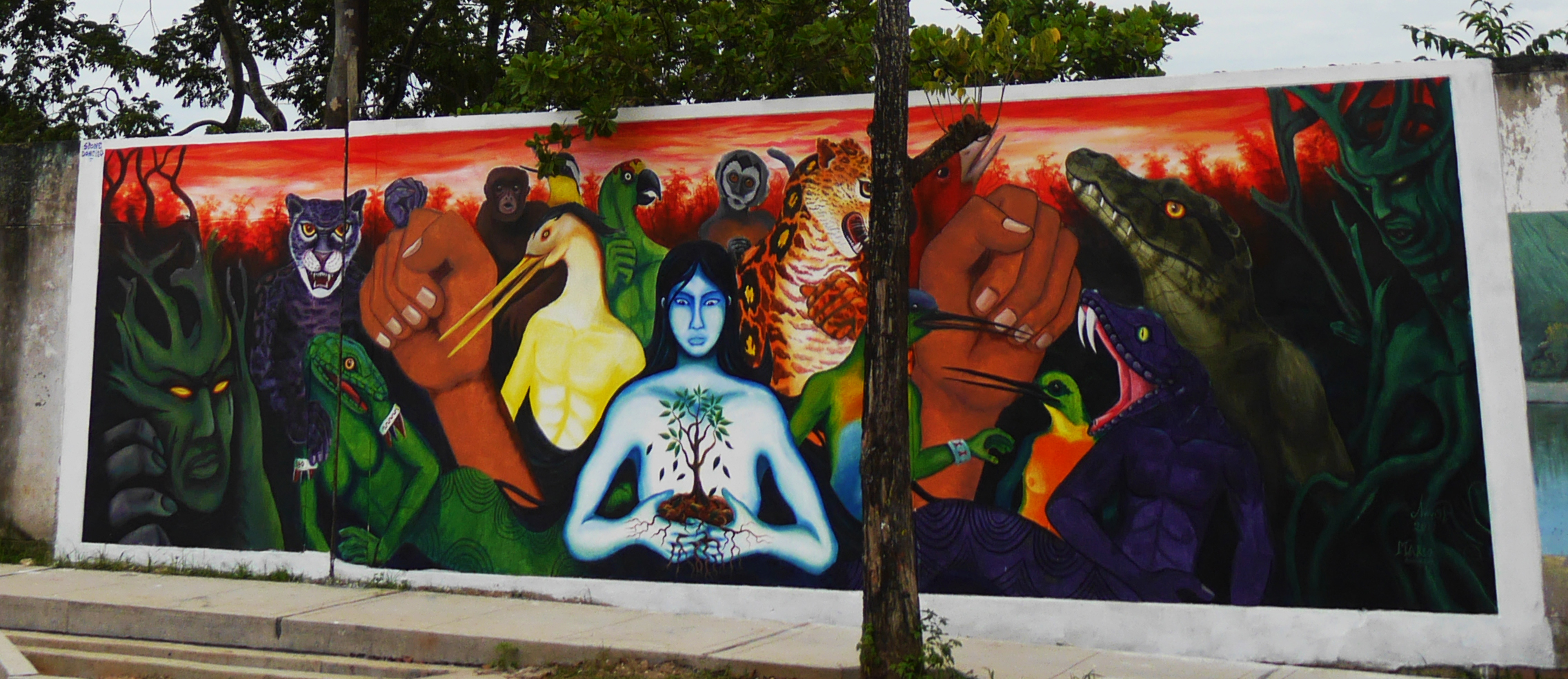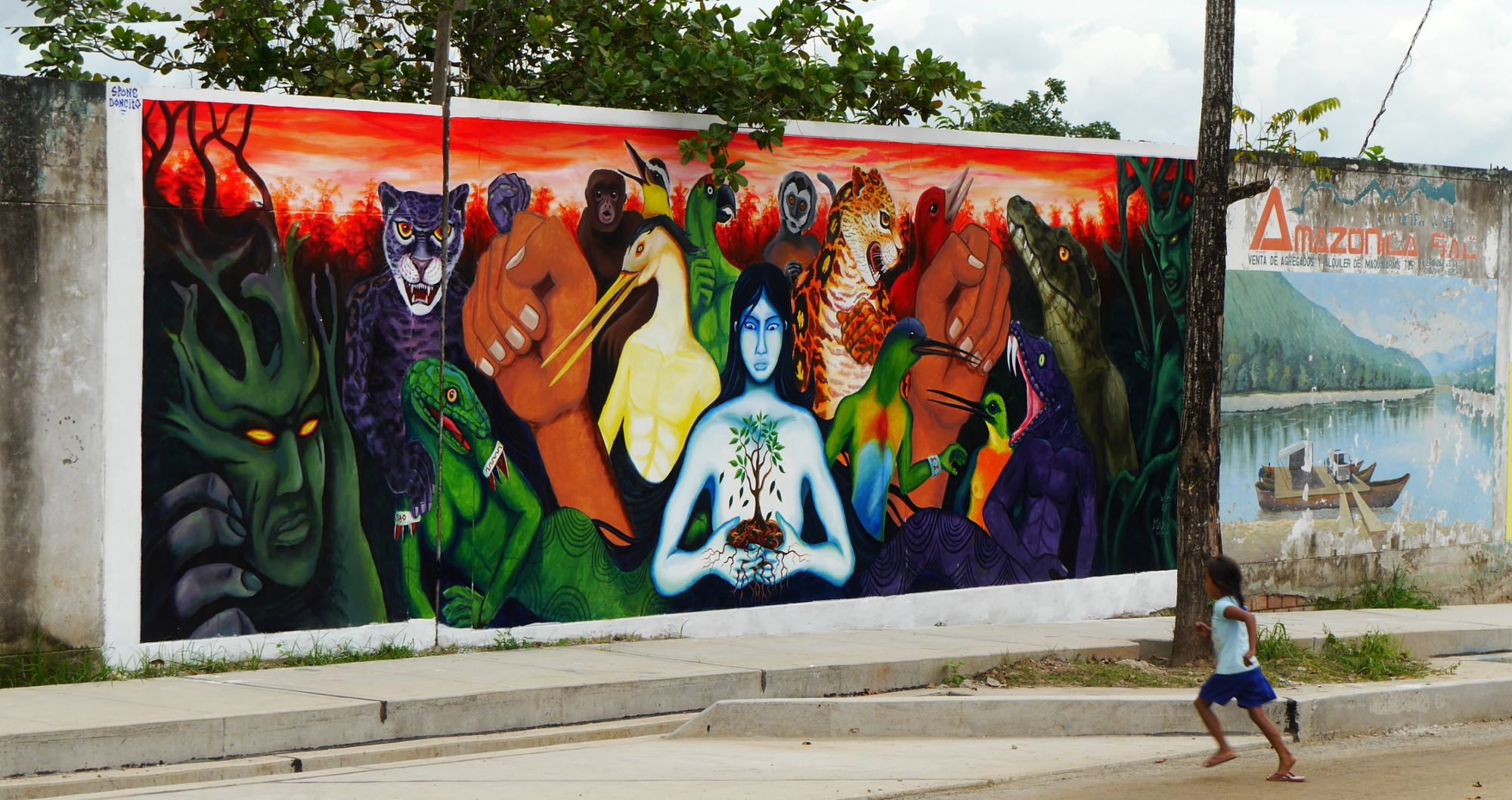 Mur peint réalisé en collaboration dans le cadre du Forum Social Pan-Amazonien ( FOSPA ) de 2017 à Tarapoto en Amazonie Péruvienne.