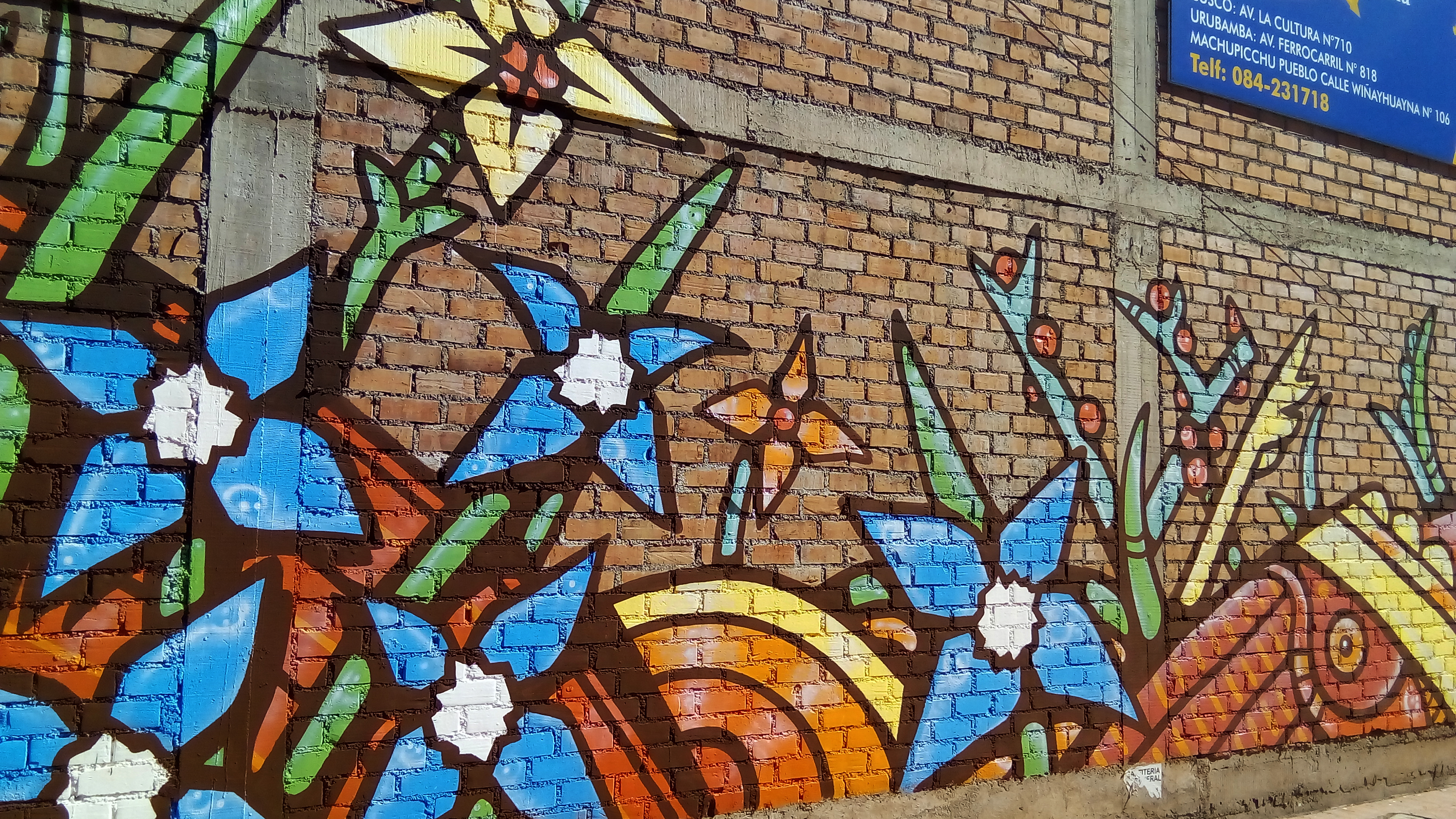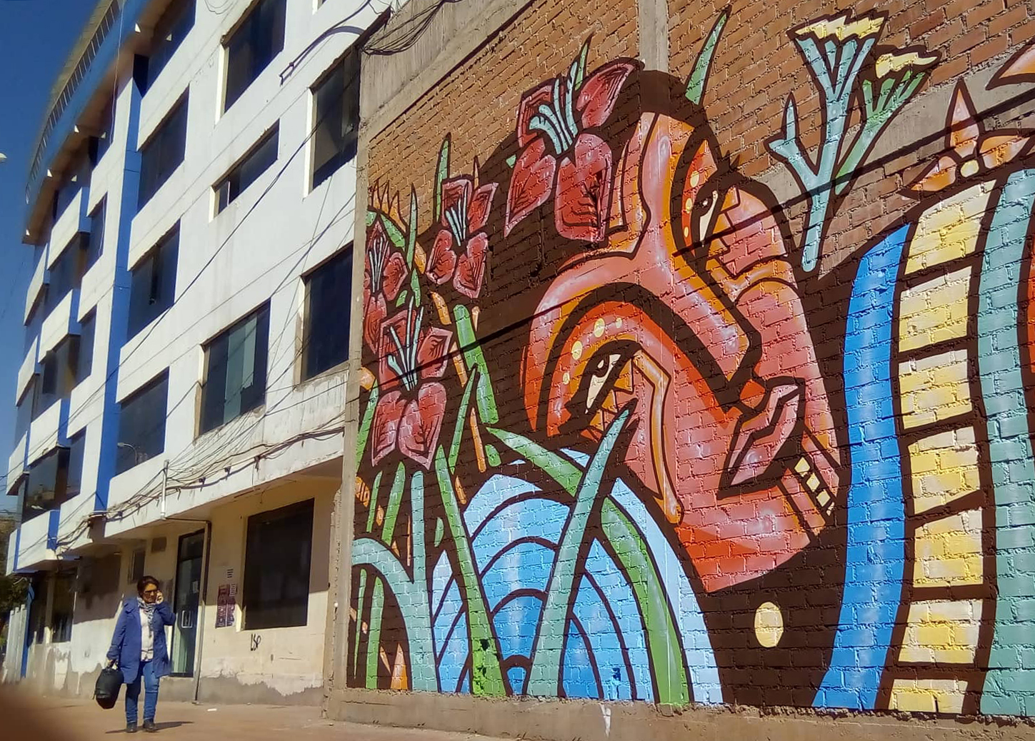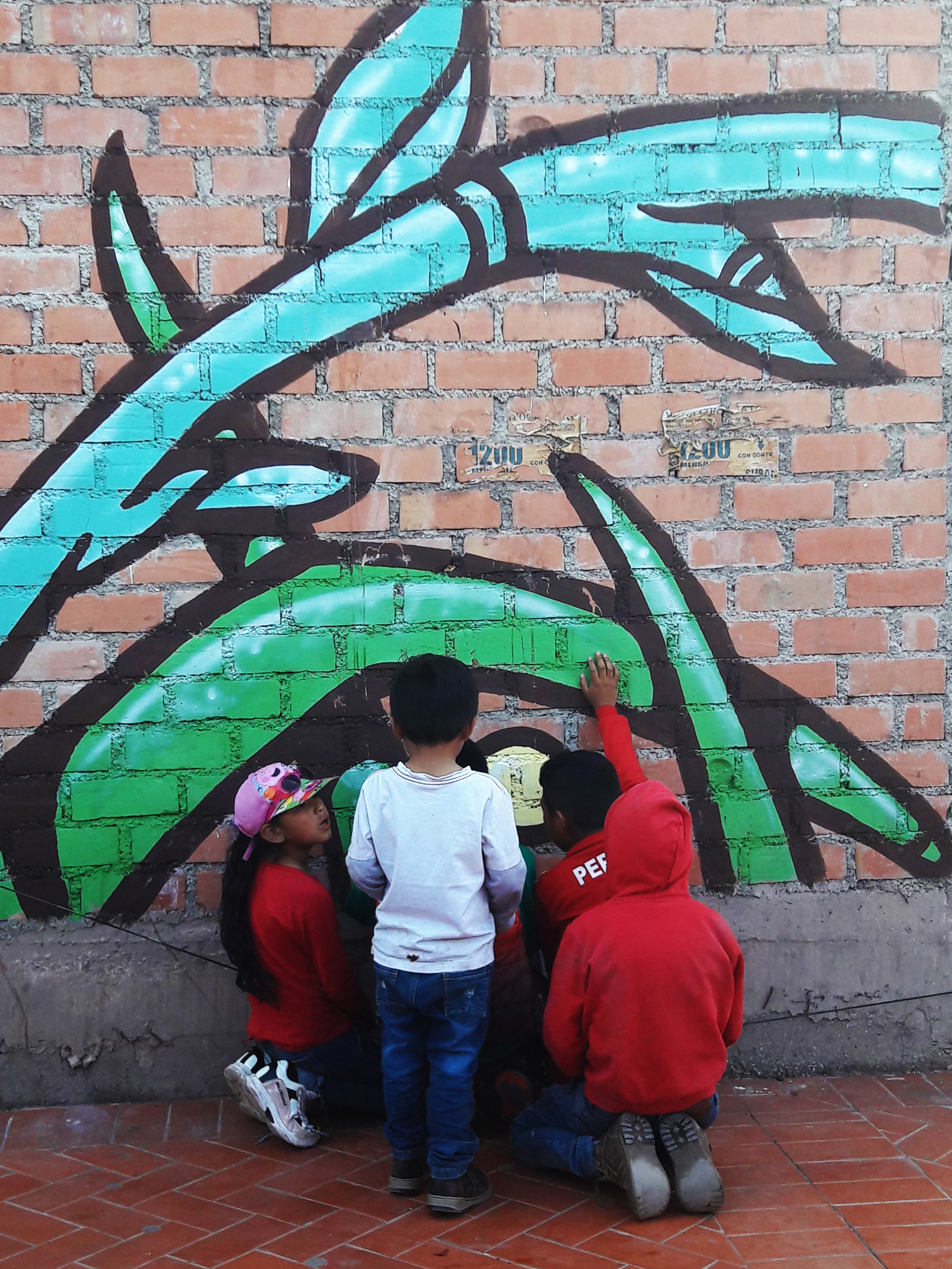 La lutte pour la vie Mur de 25 mètres de long par 8 mètres de haut. Réalisé à Cusco, Pérou sur la façade d’une clinique dans une rue piétonne. Peinture acrylique, brosses et spray blanche – 2019 Similaire