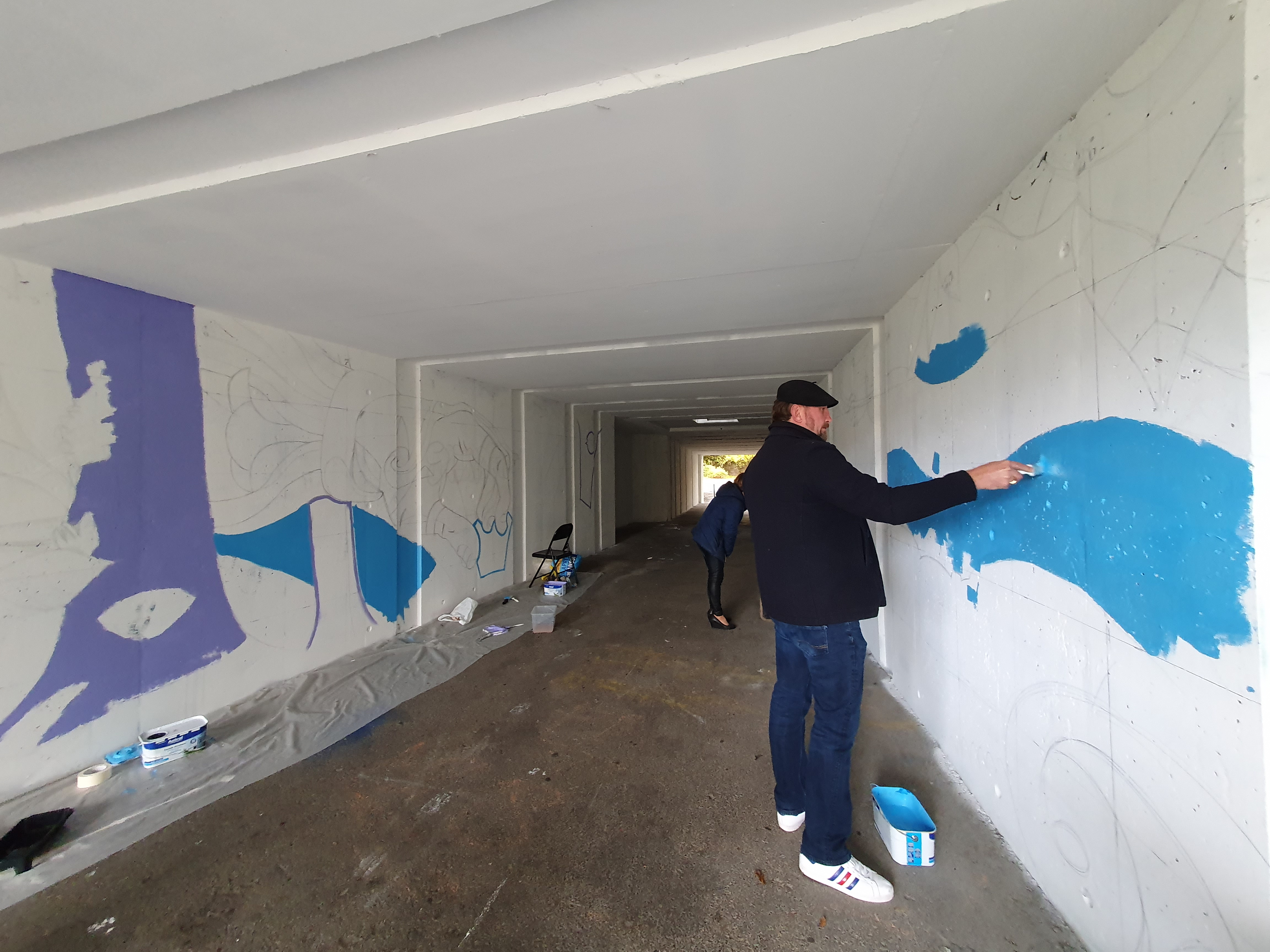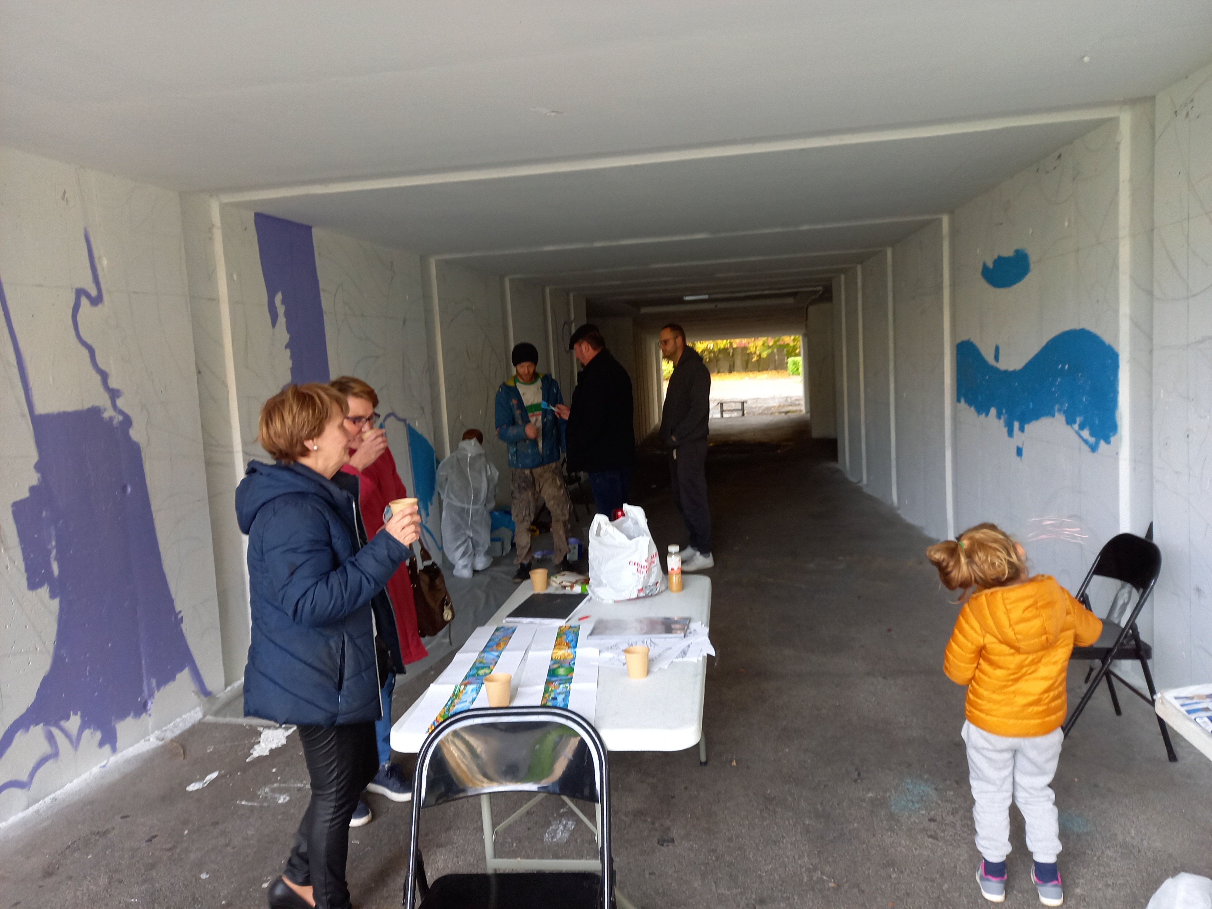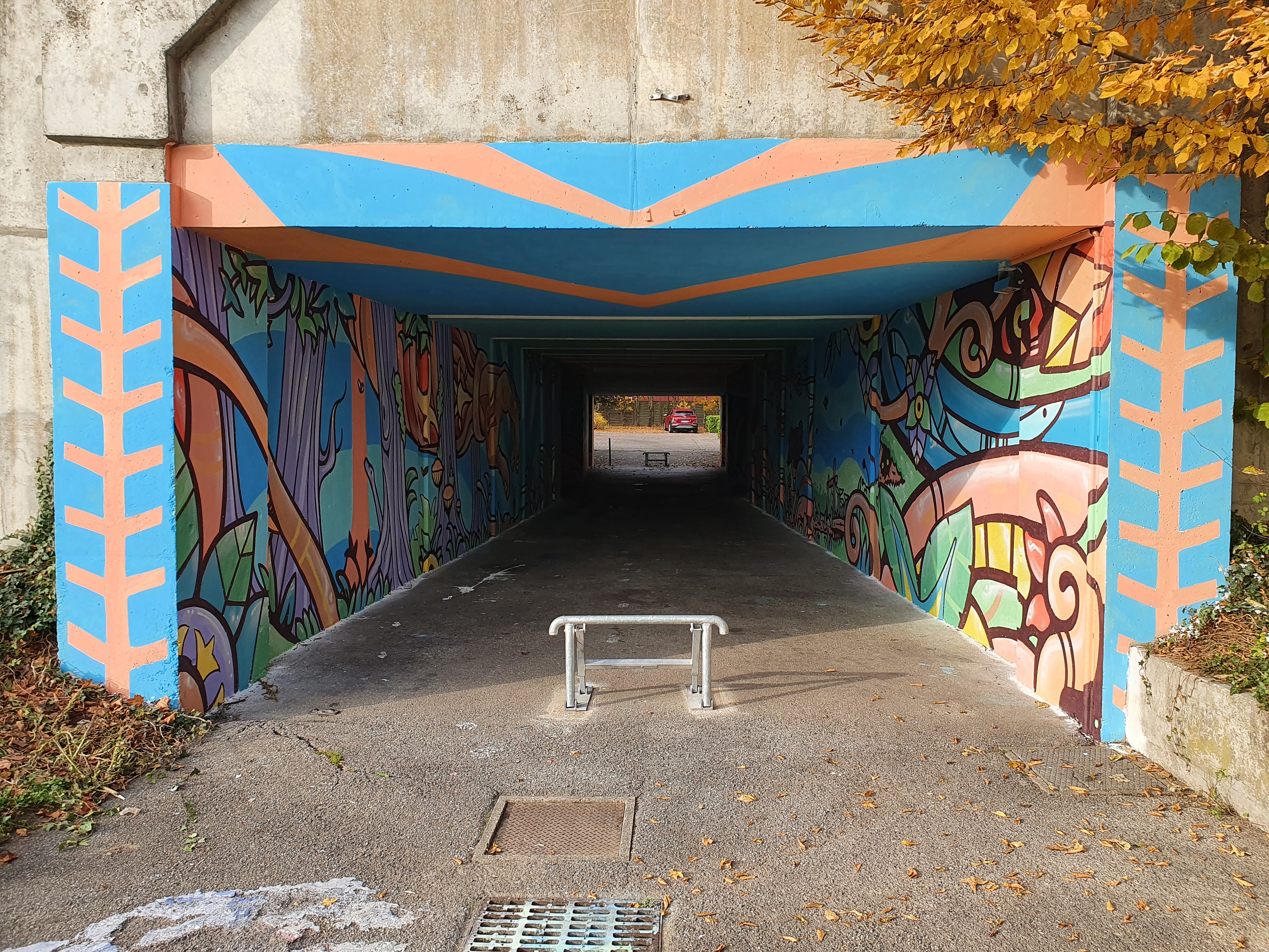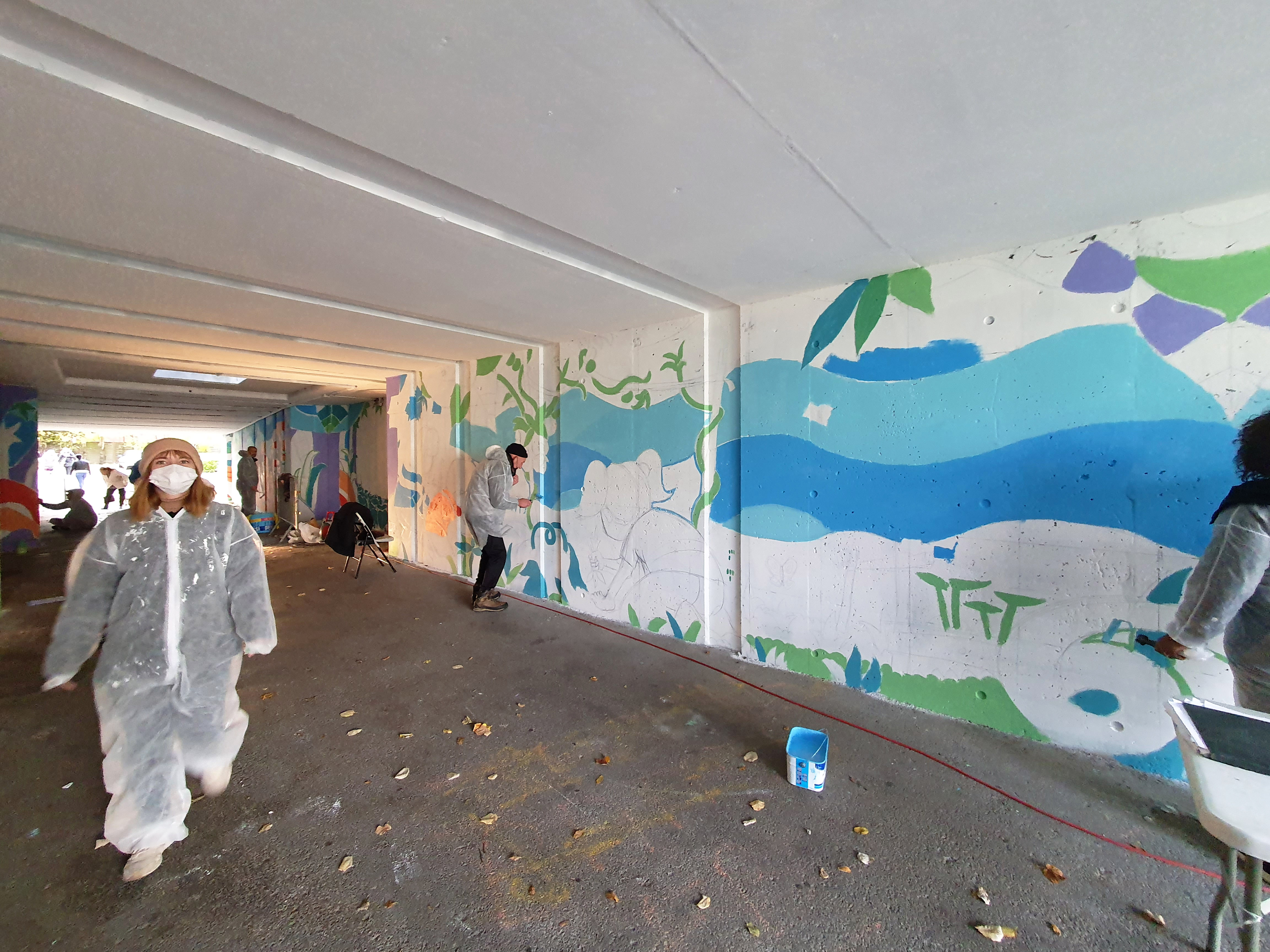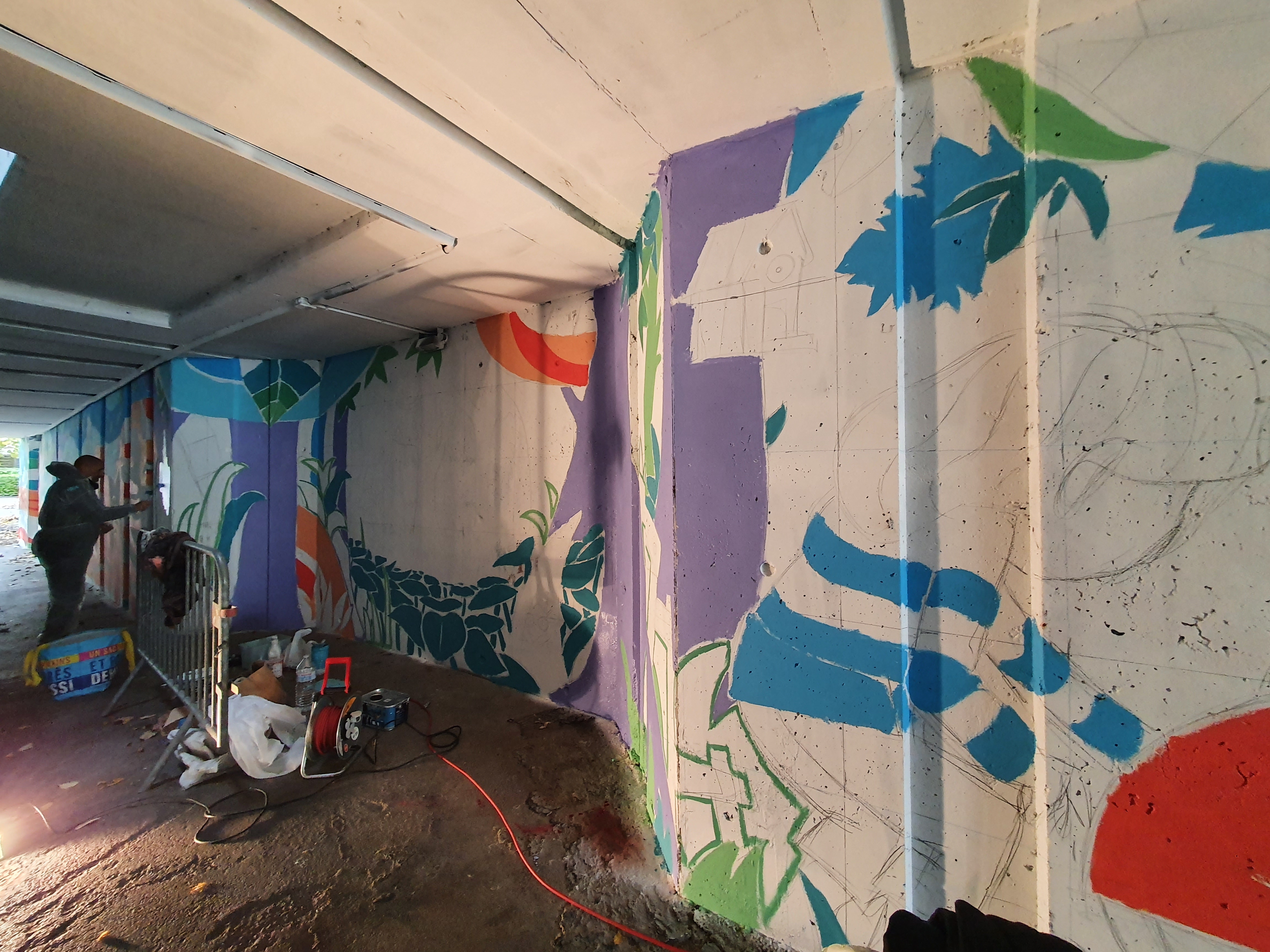 Réalisation de fresques sur les murs et plafonds de deux tunnels piétons dans le cadre d’ateliers participatifs.