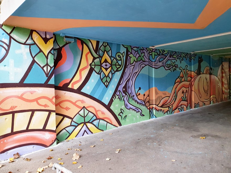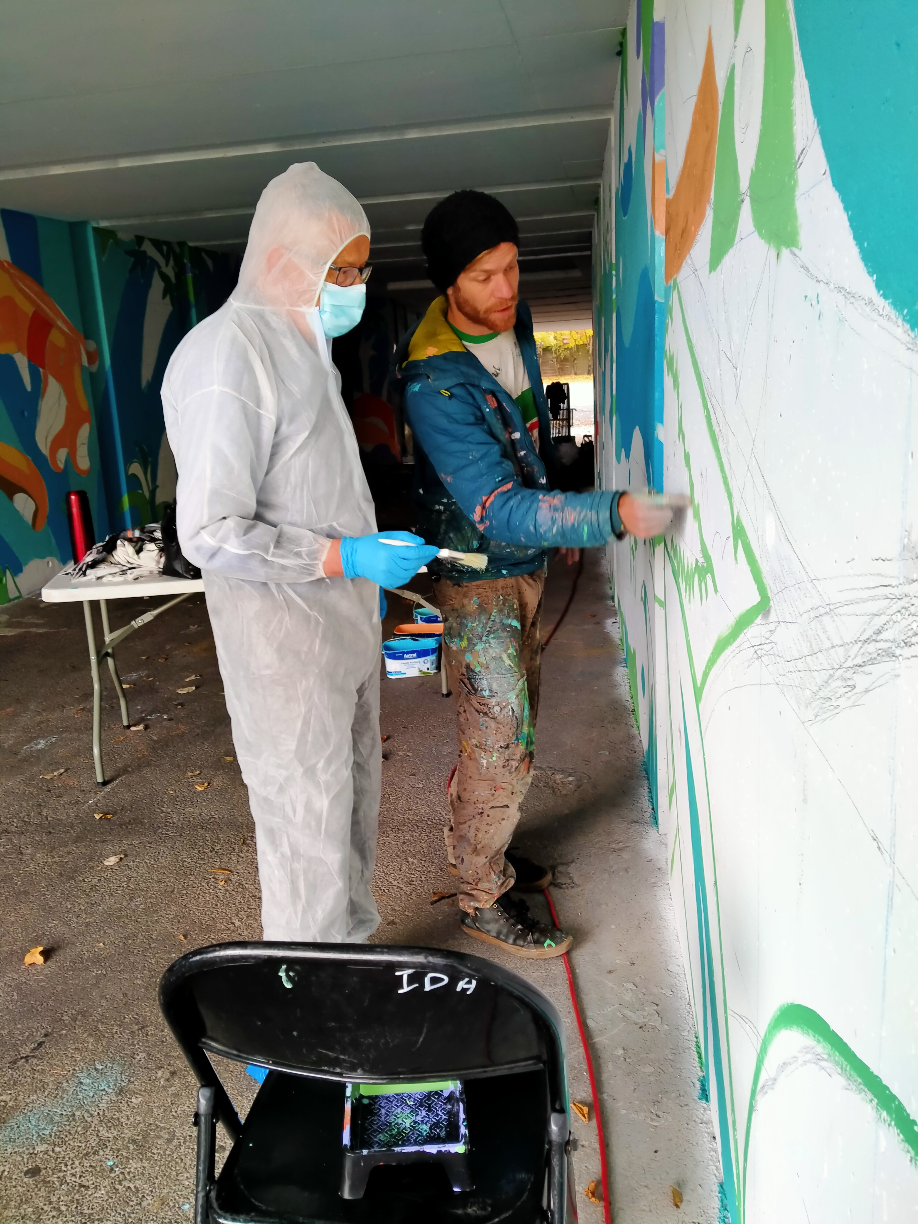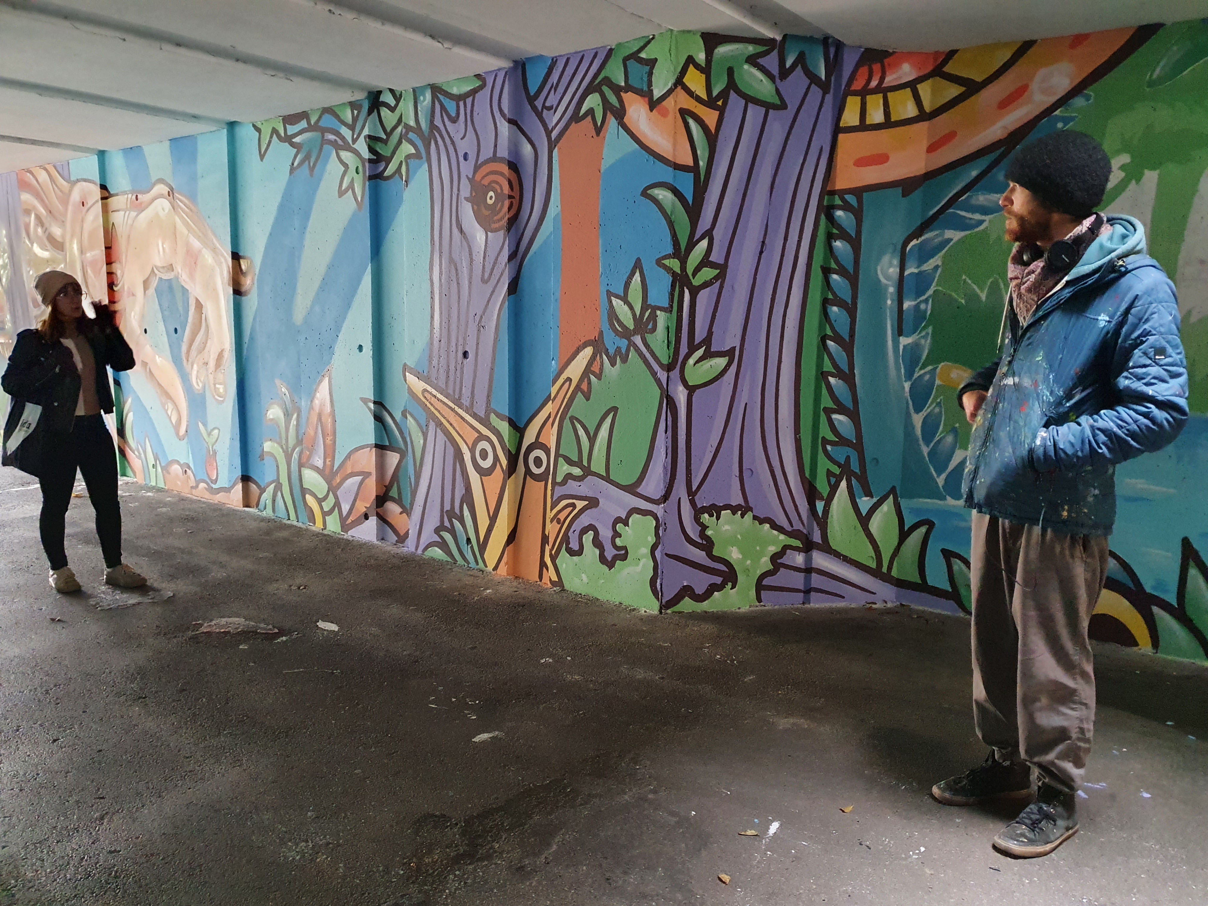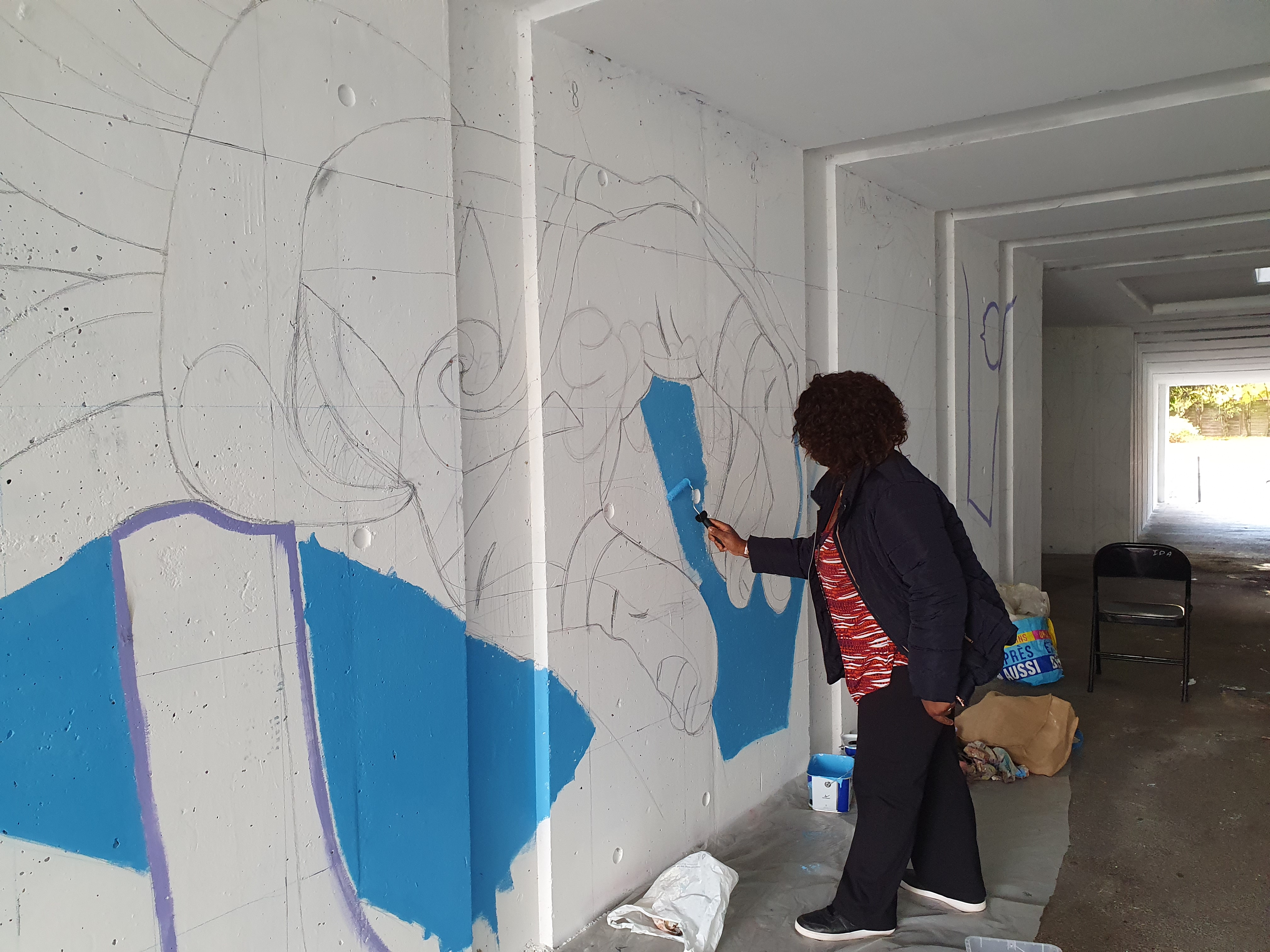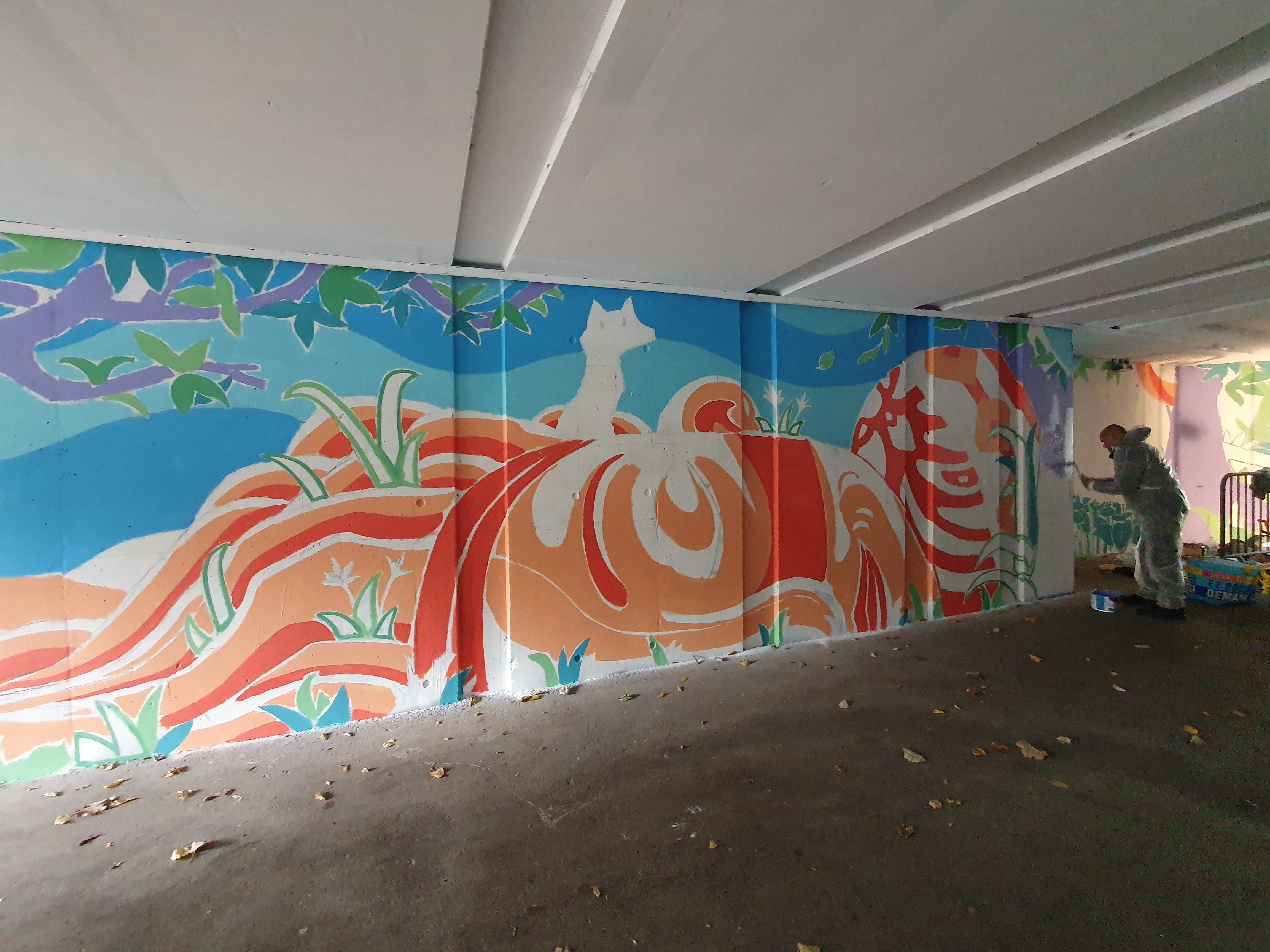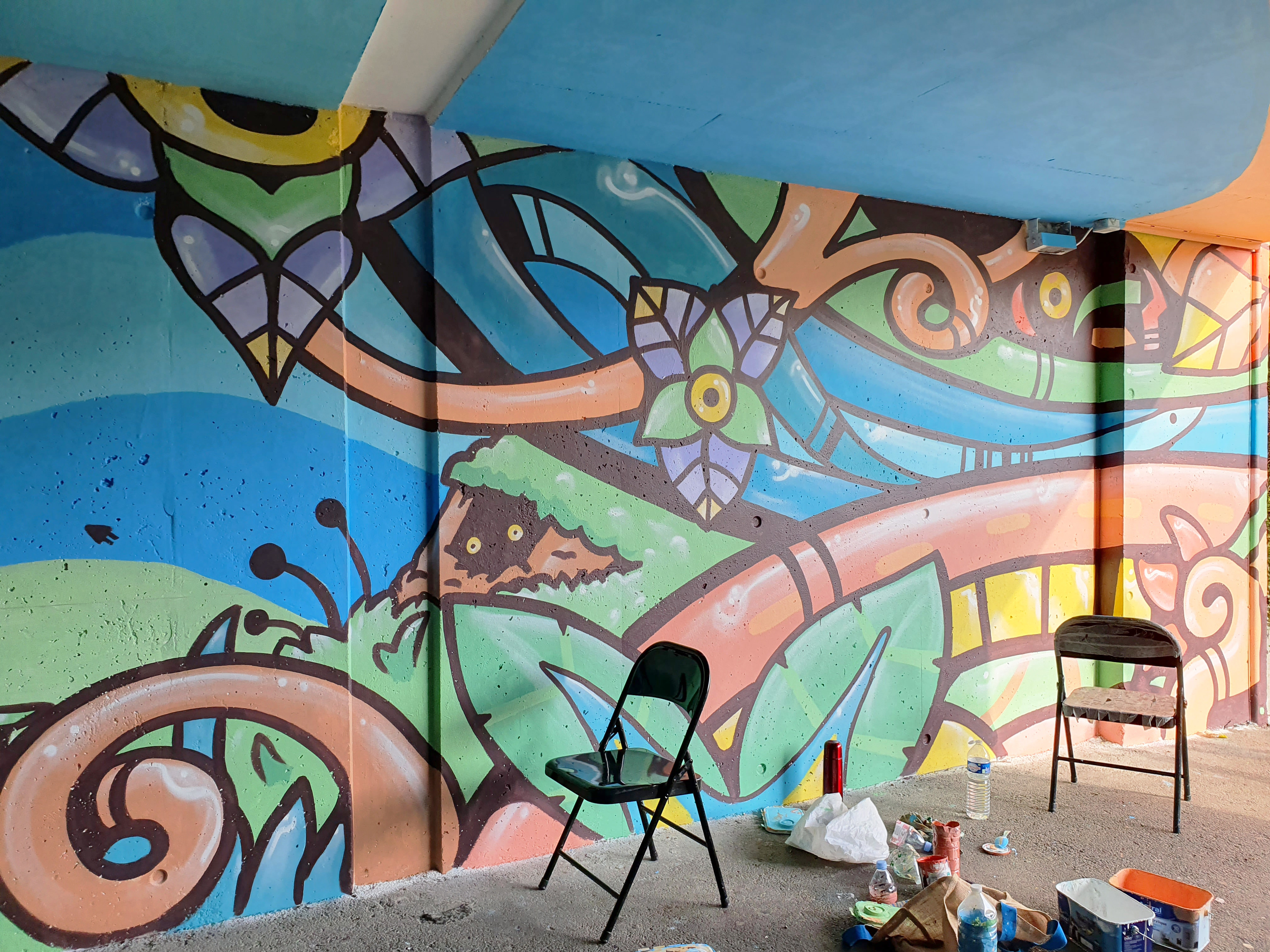 Réalisation de fresques sur les murs et plafonds de deux tunnels piétons dans le cadre d’ateliers participatifs.