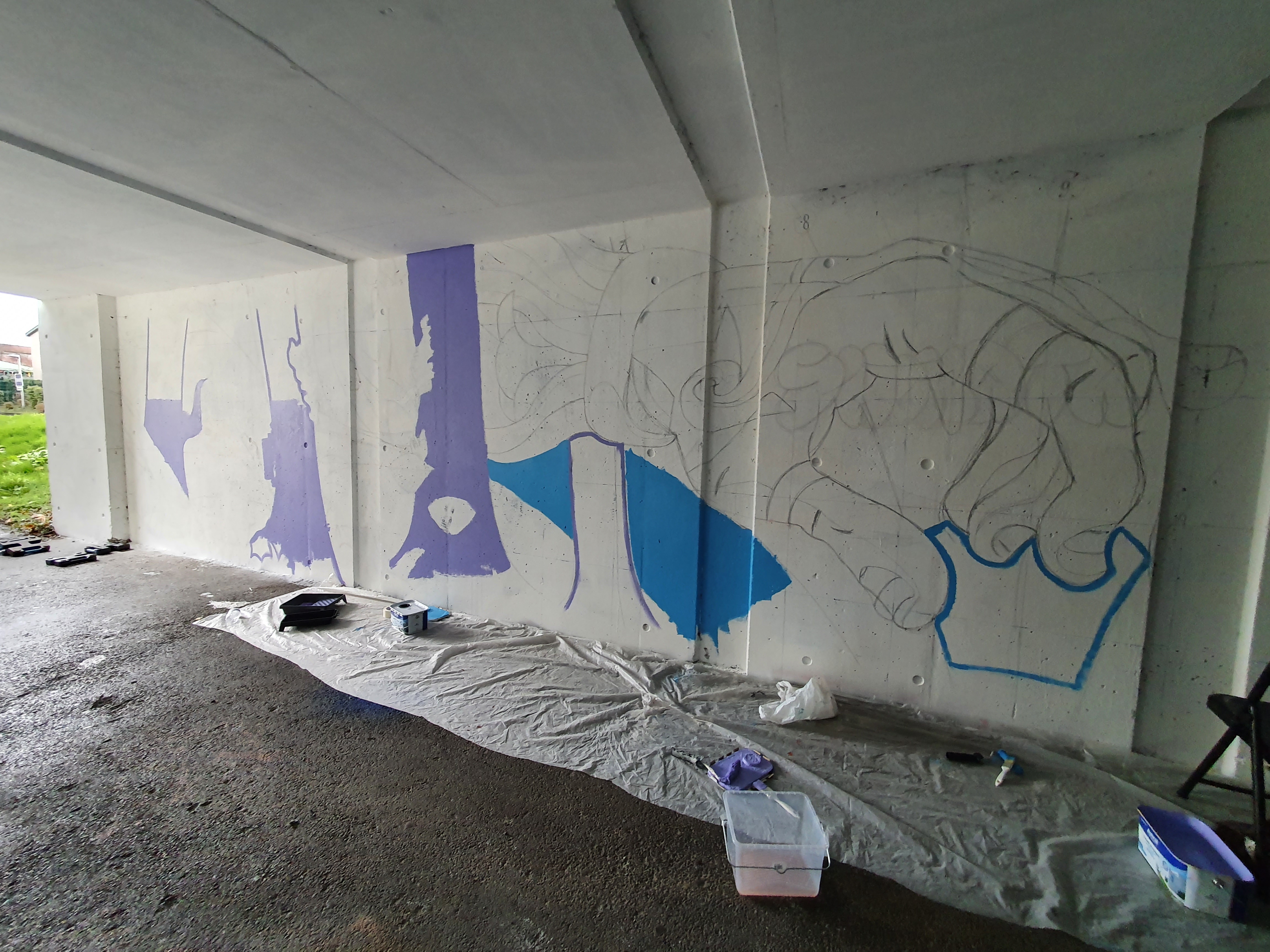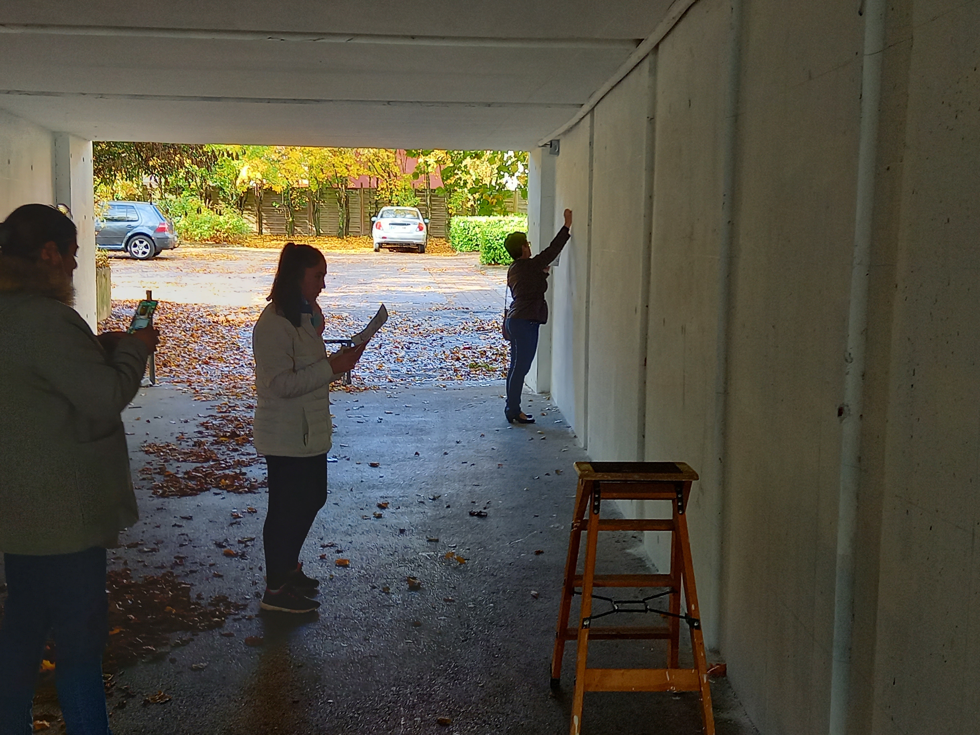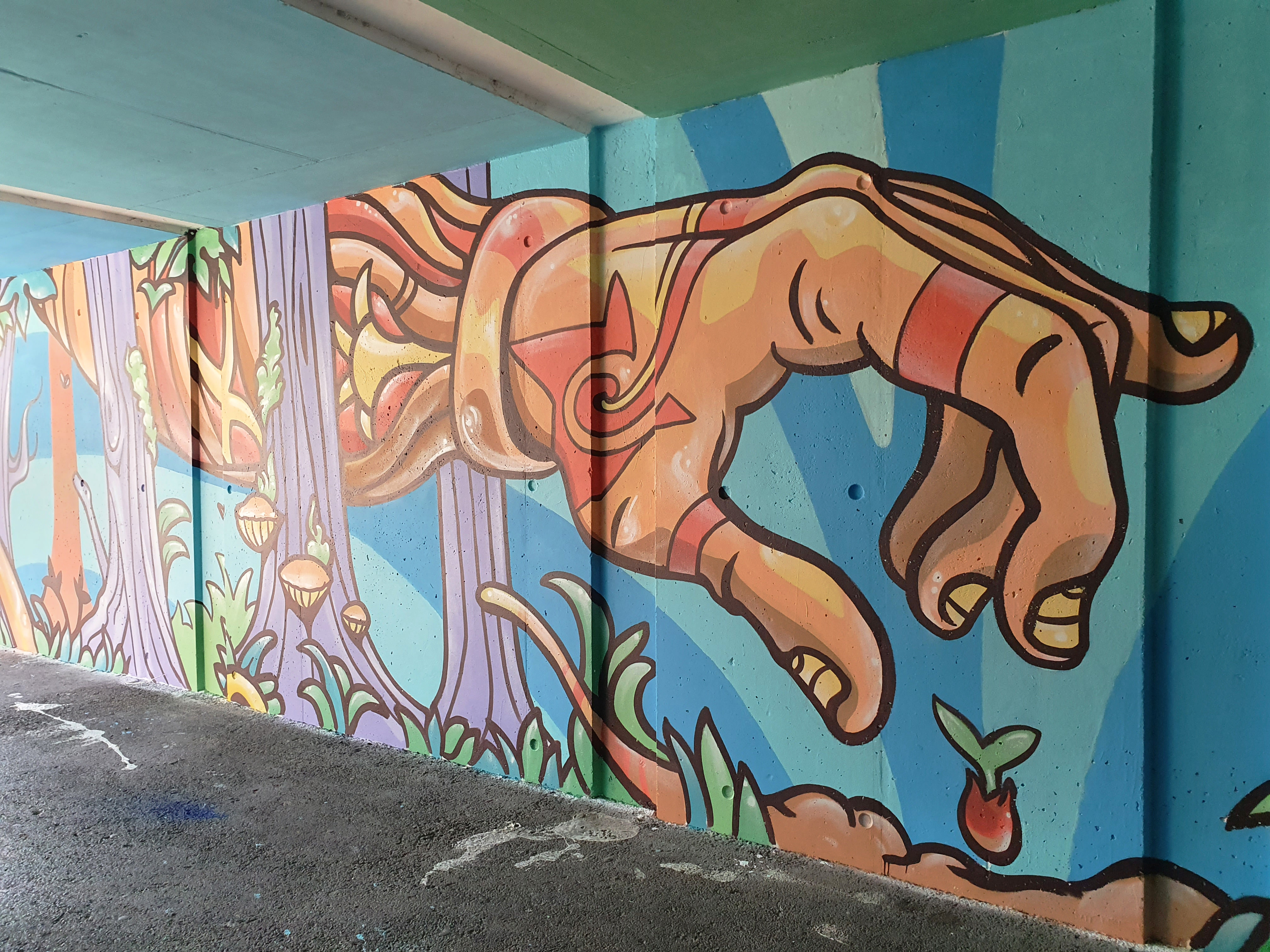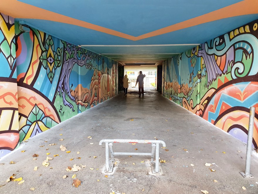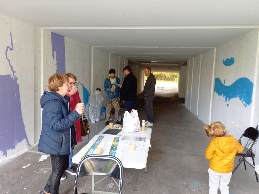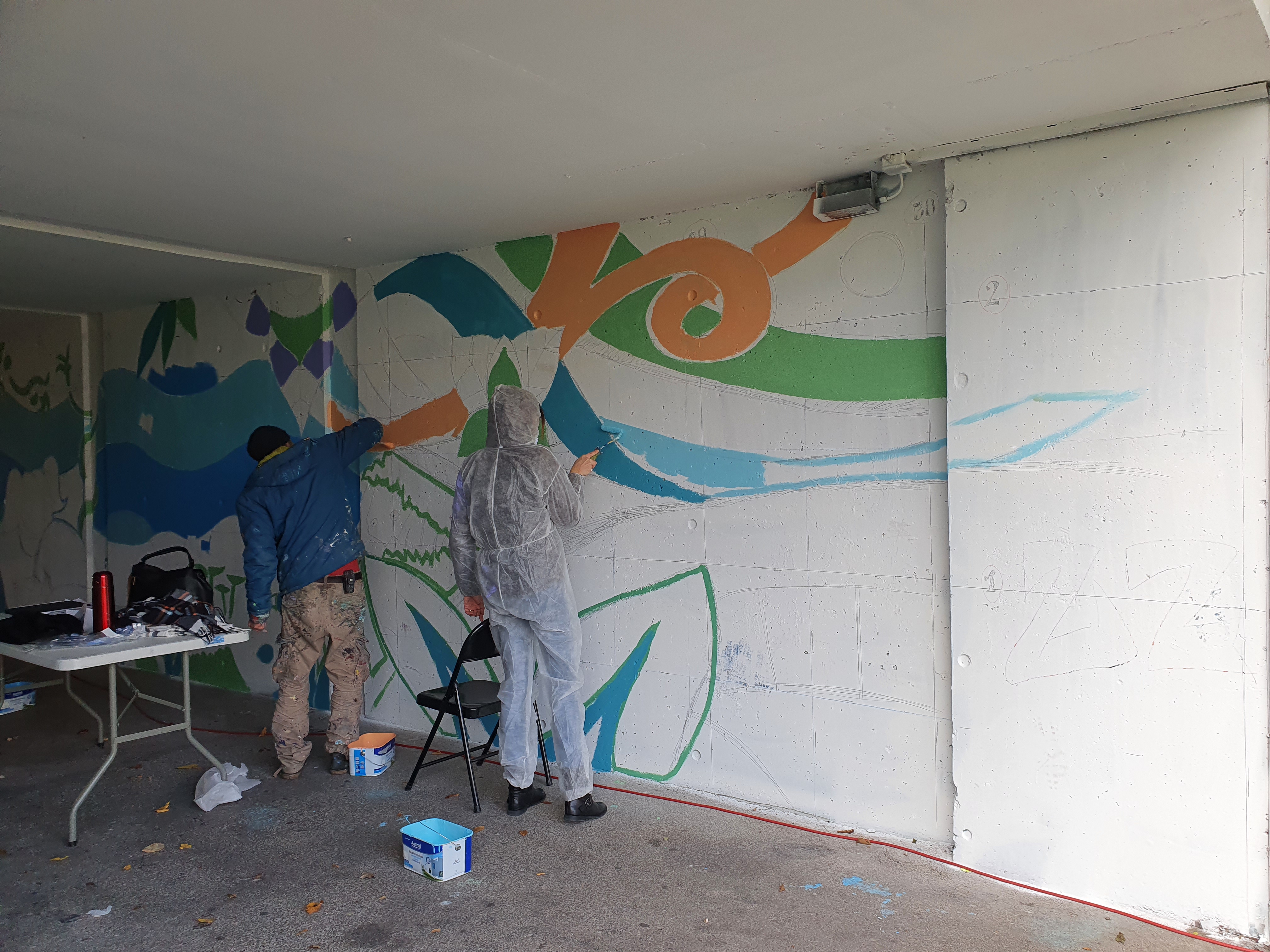 Réalisation de fresques sur les murs et plafonds de deux tunnels piétons dans le cadre d’ateliers participatifs.