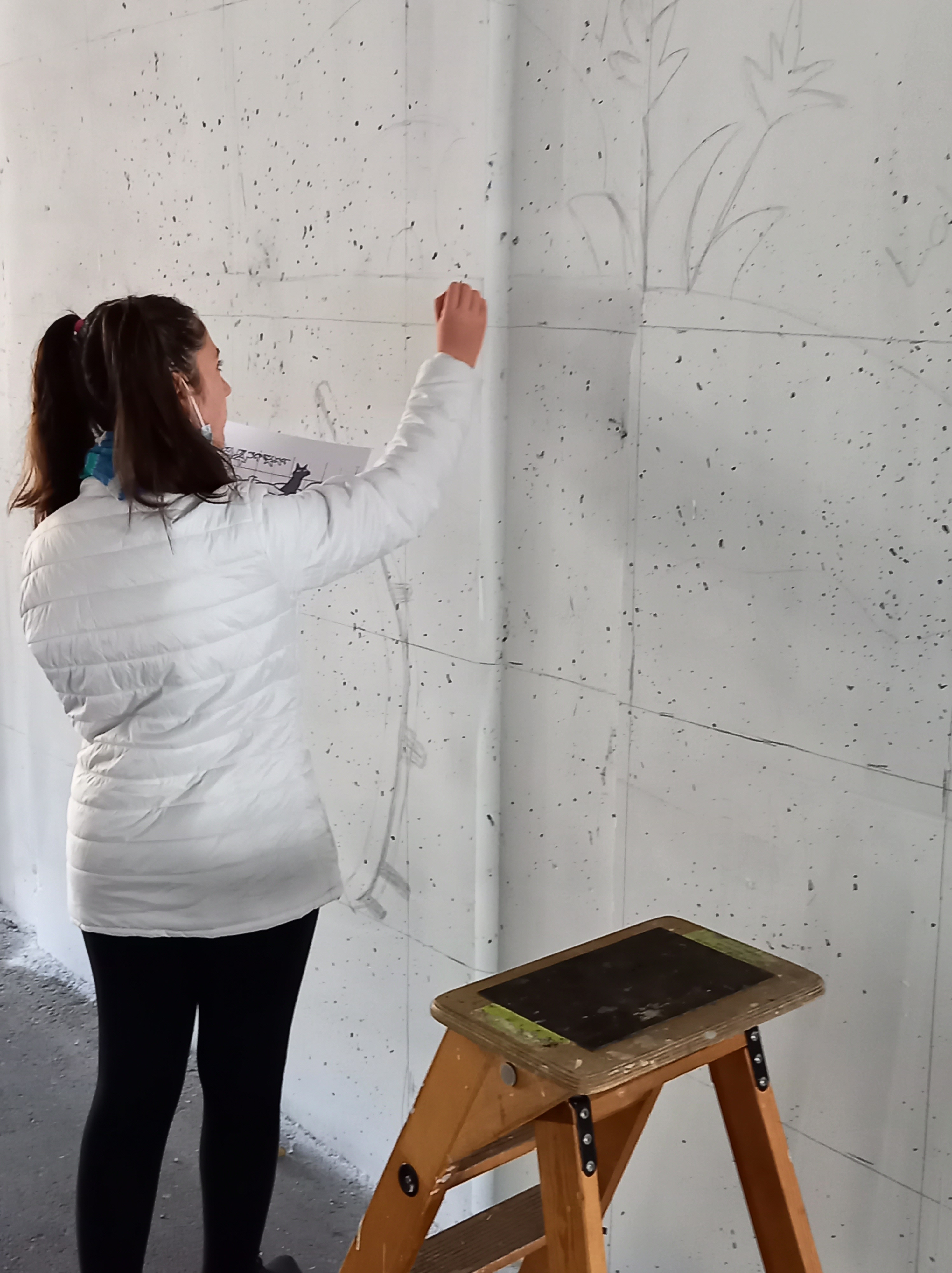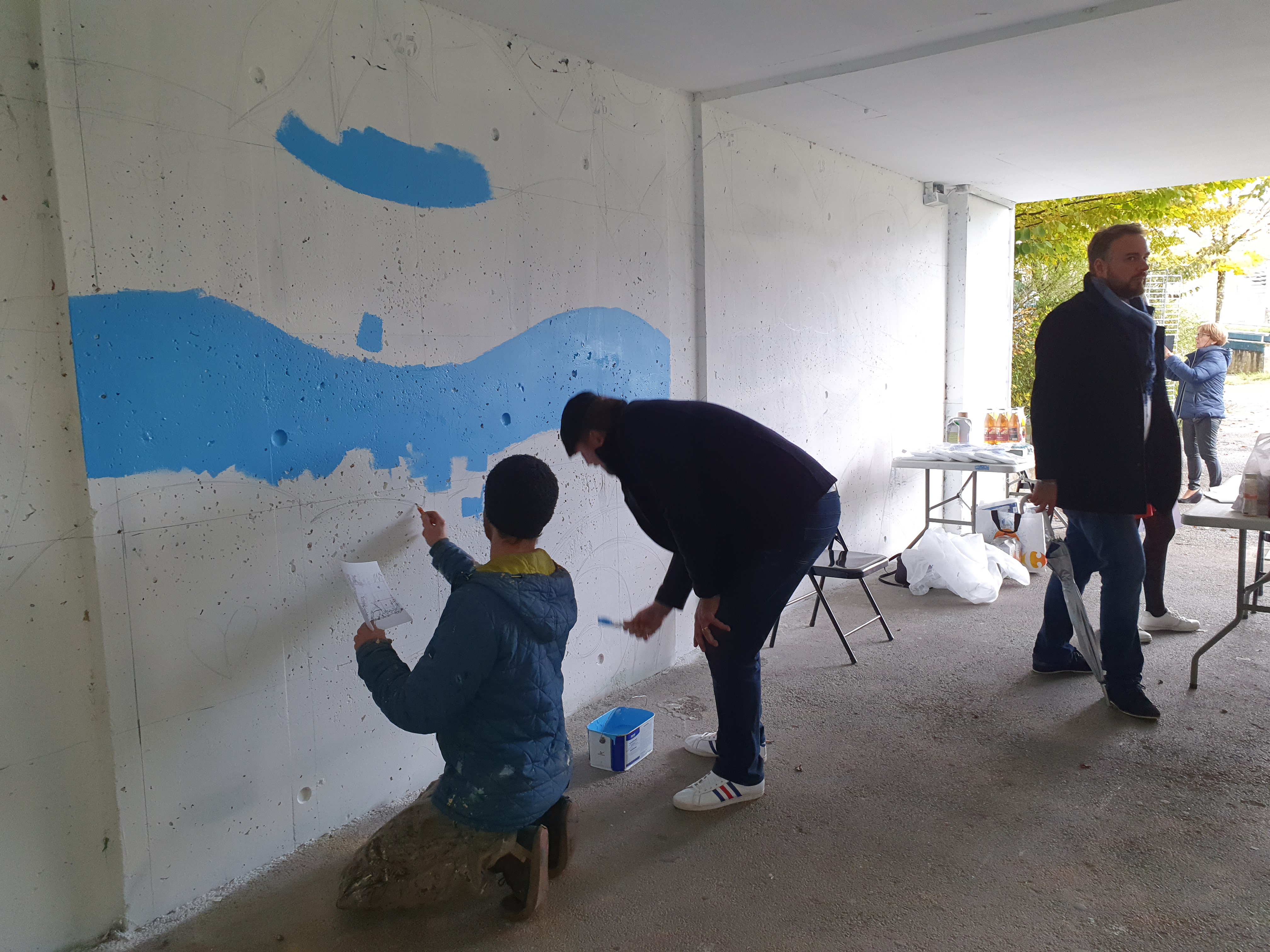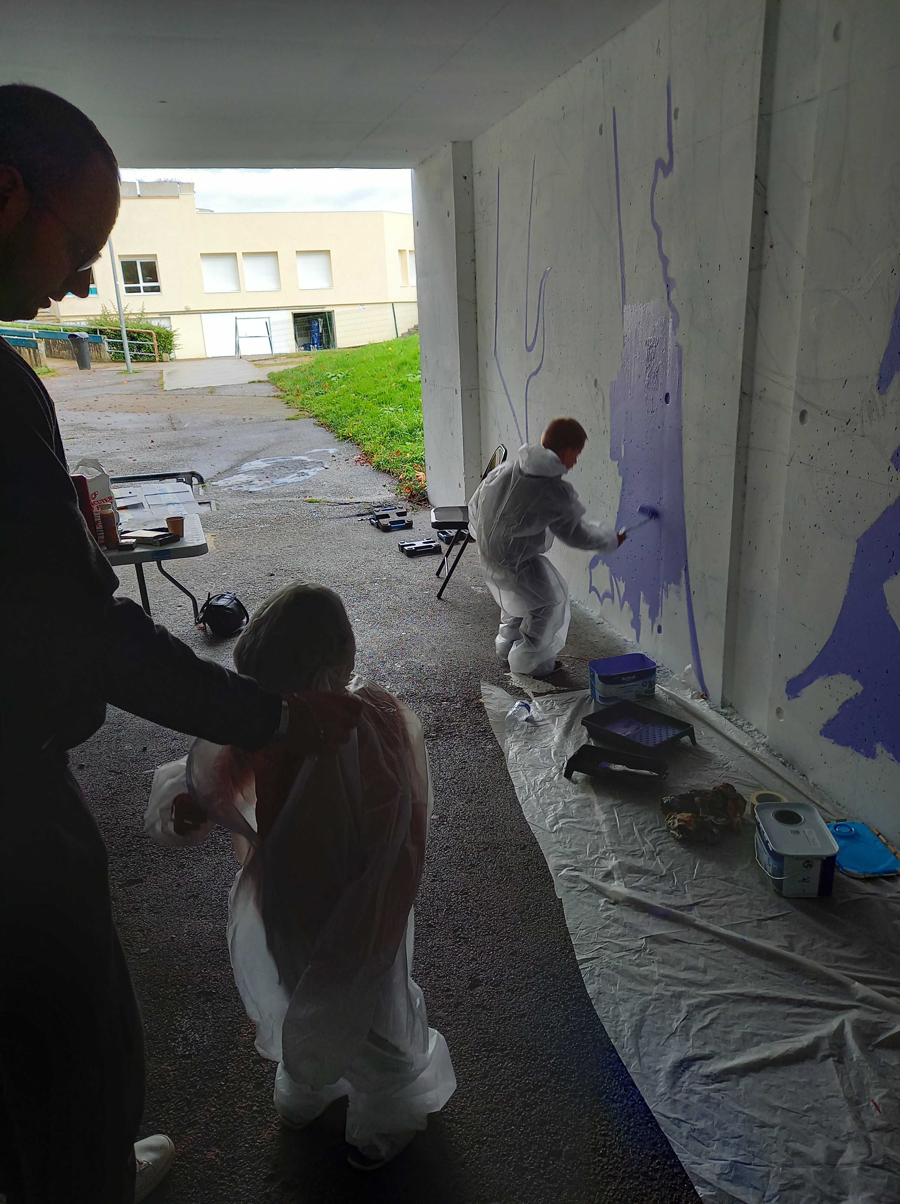 Les murs ont été peints avec plusieurs publics, collégiens, mission locale, centre d’hébergement, maison de repos, passants improvisés et autres lors de la pose des couleurs ou de l’esquisse grâce à un système de quadrillage.